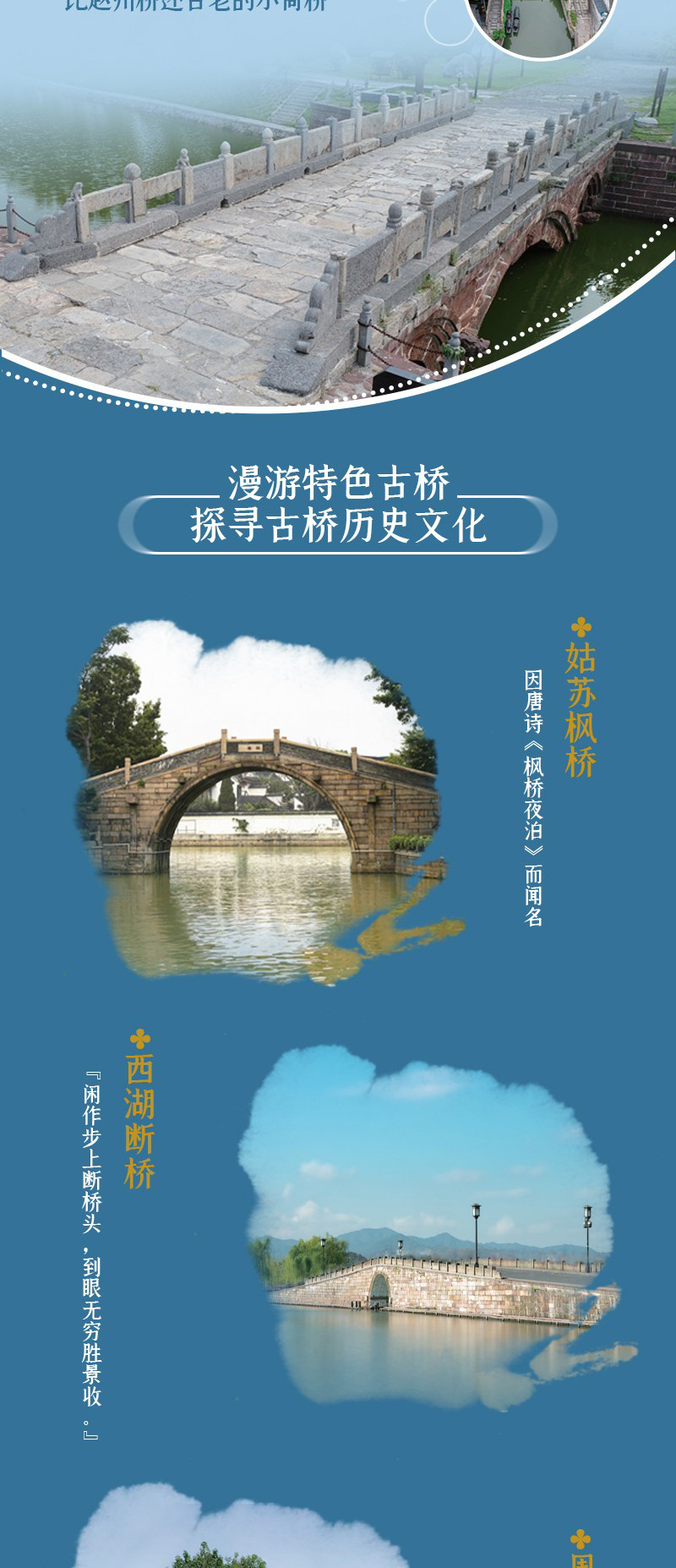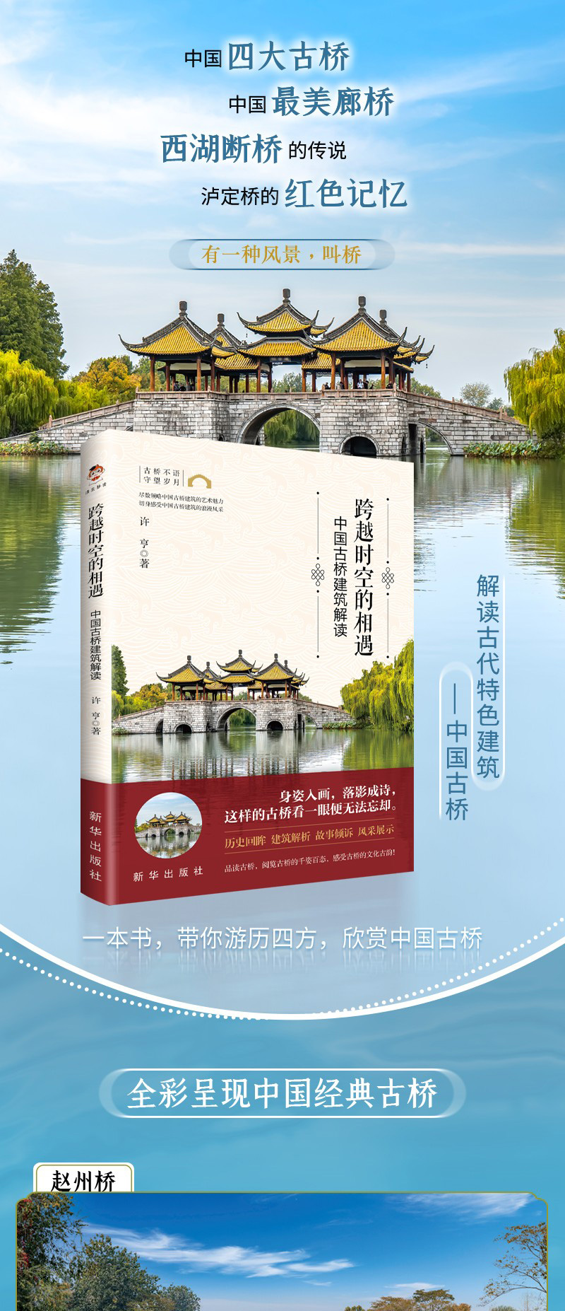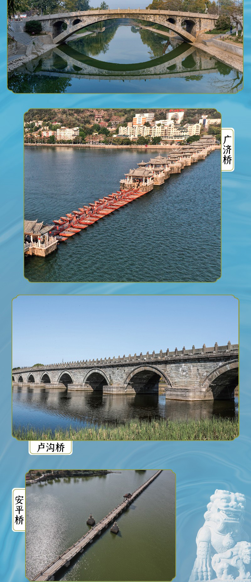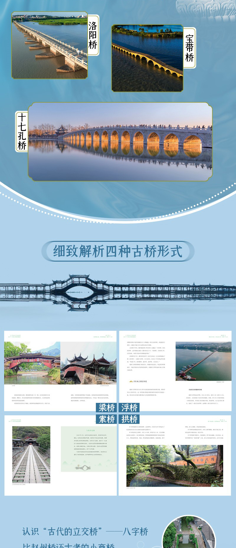 第二章 历史悠久,闻名遐迩:经典古桥 中国古桥作为中国古代特色建筑,建筑造型和建筑技艺闻名遐迩,令世人惊叹。远观或近瞻这些古桥,不禁会惊叹于古人的创造智慧,被古桥背后的建筑文化所折服。 忆岁月匆匆,赏古桥悠悠,跟随历史的脚步,去探赏中国经典古桥,领略中国古代名桥的魅力。 海内第一桥——洛阳桥 洛阳桥是一座有着悠久历史的宋代古桥,是中国古代“四大名桥”之一,有“海内第一桥”的美誉。 跨江接海的洛阳桥 洛阳桥,位于今福建省泉州市,由宋朝泉州知府蔡襄督造,始建于1053年(宋皇祐五年),是一座梁式跨海石桥。洛阳桥位于洛阳江出海口处,现存全长约731米、桥宽约4.5米,共有47孔、45座石墩。 洛阳桥自宋朝始建,前后经历了大约六年的时间终于建成,此后投入使用至今,其间经过多次修缮,如今的洛阳桥仍保留了较为完整的原始风貌。 洛阳桥的桥墩、桥面、桥身均采用了质地坚硬的花岗岩,建桥所用的花岗岩块大、体重,据测量,桥板所用的整块花岗岩最长有 11米长,洛阳桥可谓名副其实的大石桥。 别出心裁的建筑设计 洛阳桥的建成在中国桥梁建筑史上有着非常重要的意义。它的多项打破常规、别出心裁的建筑设计均为后世桥梁的建造提供了重要的参考经验。 首先,“筏形基础”在古代建桥史上具有创新意义。 洛阳桥位于江面跨度大、波涛汹涌的洛阳江上,在建桥之初就遇到了重重困难。如当时技术和条件有限,桥基的选址、桥墩的固定、建筑石材的搬运等,都并非易事。 要使桥稳固地屹立在江水中,必须有坚固的桥基,据说,初建洛阳桥时,很多投入江中的石块都被江水冲走了,于是人们便采用“筏形基础”这种技术来建桥。 具体操作方法是,用船装载大石块,行至江中,沿着规划好的桥梁中线的位置,将船中石块尽数抛下,在水中铸就了一道水下堤坝,然后在水下堤坝上建桥基、桥墩。洛阳桥桥基呈石船形状,中间方,两头尖,方便桥基分水和减少水对桥基的冲刷。 其次,“浮运架梁”彰显了古人桥梁建造的高超智慧。 在洛阳桥未建成之前,江水涨落会让桥基和桥墩时隐时现,也正因如此,人们选择以水运石,借助洛阳江江水的潮起潮落,将石梁架设在桥墩之上,就地取材地借用了江水的运载力。 最后,“种蛎固基”是当时世界范围内造桥技术的创举。 为了使洛阳桥的桥基更加牢固,建桥工匠在桥基处养殖大量的牡蛎,牡蛎附着力强、繁殖力强,这样桥基和桥墩就像是用“胶水”牢牢地粘在一起一样。这种固基方法科学环保,为世界首创,是将生物学技术应用到建筑实操中的成功典范。 初日出云,长虹饮涧——赵州桥 赵州桥,又名安济桥,是世界现存年代久远(距今有1400余年的历史)、跨度最大、保存最完整的单孔坦弧敞肩石拱桥。赵州桥犹如一道长虹落于洨河之上,唐代张鷟在《朝野佥载》卷五中称赵州桥:“望之如初日出云,长虹饮涧。” 结构精妙的石拱桥 赵州桥始建于隋朝,位于今河北省赵县城南,由李春设计并督建。宋朝时期曾被宋哲宗赐名安济桥,此后,“安济桥”便成为该桥的正名,但在民间,“赵州桥”这一名字流传更广。 赵州桥为石拱桥,在世界桥梁建筑史上首创“敞肩拱”结构,可以说为此后敞肩拱桥提供了标准的建筑模板,具有非常高的建筑研究价值。 赵州桥建筑结构极其精妙,这正是其屹立千年不倒的重要原因。 具体来说,赵州桥的结构巧思主要表现在以下几个方面。 首先,赵州桥的桥拱为敞肩圆弧拱,拱肩两侧各建两个对称小拱,桥拱的跨度和分力均匀,桥体坚固。 其次,赵州桥的最大的桥拱跨度大,因此桥拱的弧度并不高,而是趋于平缓。单孔长跨,拱下无墩,便于泄洪。 最后,赵州桥的桥面两侧桥头处较宽,桥拱弧顶的桥面较窄,这样的设计使得桥的力量向两边分散,再加上石头的纵向砌筑,更增加了赵州桥的稳固性。 工艺精湛的桥梁石雕 赵州桥上有许多精美的石浮雕,这些浮雕多以龙为主题(以蛟龙为主,伴有兽面、花饰等),体现了古人对龙图腾的崇拜。古人认为,有龙的地方就有水,龙能兴云布雨,可镇压波浪,因此在桥上雕刻龙形图案,旨在祈求桥梁稳固、地方安宁。 赵州桥的龙形雕刻充分体现了隋朝雕刻技法风格,赵州桥的栏板上的龙形浮雕刀法苍劲有力、造型新颖、风格豪放。同时,桥体亦有许多刻画精细的雕刻装饰。 据不完全统计,赵州桥的栏板、桥体有58种不同的龙形浮雕形象,有威风凛凛的龙头石雕,有相互缠绕的蛟龙石雕,有双龙戏珠石雕,还有双龙相抵嬉戏的石雕,等等。这些龙形态各异,刻画生动,具有极高的艺术价值。 以双龙双足相抵的一组石雕为例,在这幅石雕作品中,左龙矫健有力,右龙蜿蜒灵动,双龙双前爪前探,张力十足。双龙在相互抵推发力的同时,又相互回望,一收一放对比鲜明,令观者能真切感受到它们之间的力量对抗。更奇妙的是,双龙的一部分龙身隐入赵州桥的栏板之中,似乎在踏浪前行、迎风飞舞、辗转腾挪,生动刻画雕塑形象的同时,进一步加深了空间的纵深感,增加了视觉张力。 十八梭船廿四洲——广济桥 广济桥,俗称湘子桥,“十八梭船廿四洲”是其重要的特色。“洲”即桥墩,桥墩上的楼台各不相同,故有“二十四样”之说,“十八梭船”则是指广济桥桥中间可移动的船,这些移动的船连接成浮桥,构成广济桥的中间部分。 设计巧妙的启闭式桥梁 湘子桥始建于南宋乾道六年(1170年),因江水