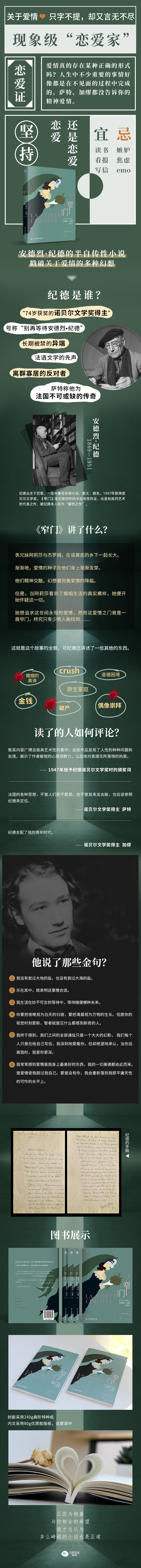 1.法语小说的典范之作,纪德“背德三部曲”的代表作。 2.名家名译,文学奖得主纪德半自传性小说,傅雷翻译出版奖得主李玉民经典全译本。 3.萨特、加缪、余华、莫言等文学大师共同推荐的经典之作。 4.纪德批判艺术的代表之作,被纪德本人称为“醒世之作。 5.生命中一段至暗的人生,一份走向背离却又牢不可破的爱情。 6.“正因为抱着与你相会的希望,我才总认为多么崎岖的小径也是正道。”