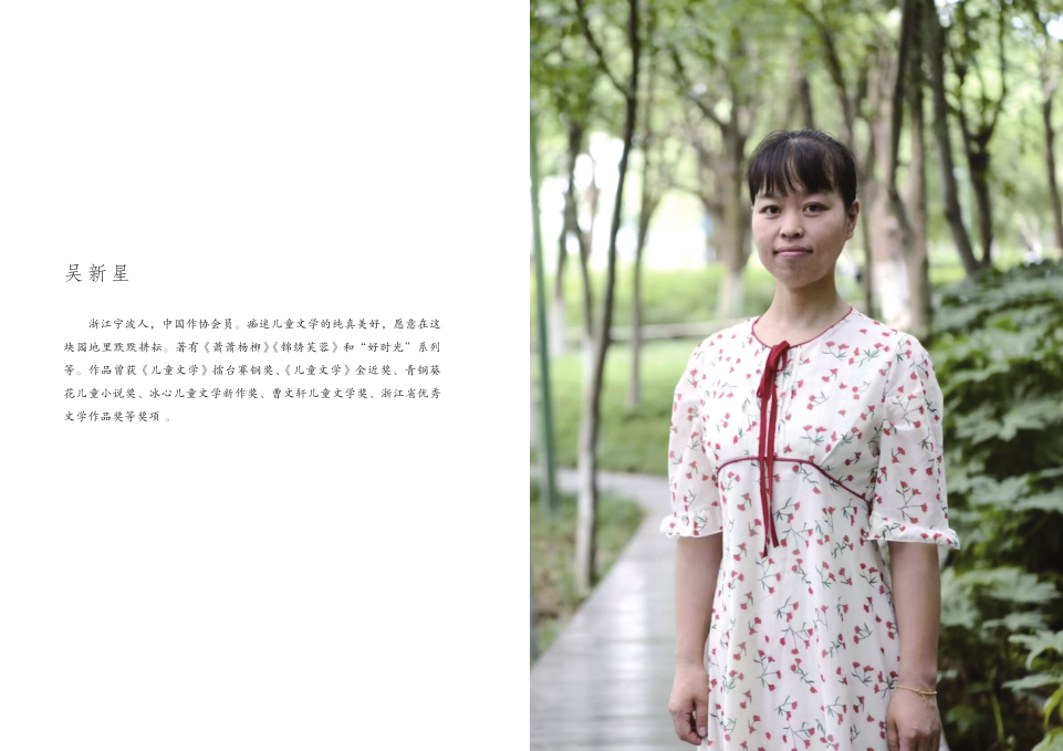 吴新星:浙江宁波人,中国作协会员。痴迷儿童文学的纯真美好,愿意在这块园地里默默耕耘。著有《萧萧杨柳》《锦绣芙蓉》和“好时光”系列等。作品曾获《儿童文学》擂台赛铜奖、《儿童文学》金近奖、青铜葵花儿童小说奖、冰心儿童文学新作奖、曹文轩儿童文学奖、浙江省优秀文学作品奖等奖项。