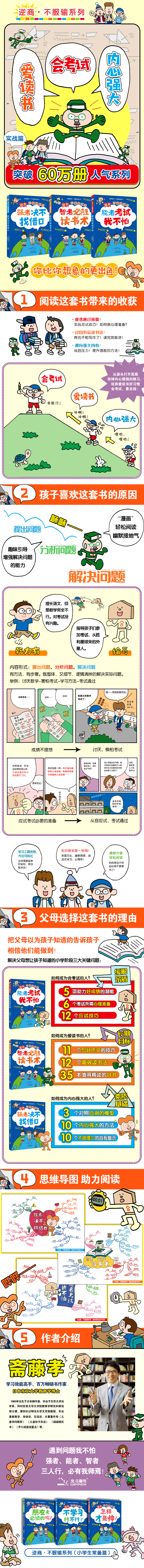 给小学生的实战学习秘籍 漫画解读,轻松获得“学霸”方法 看完这套书,将会收获: 《强者决不找借口》 伟大的时代需要强大的内“芯”,相信自己! 3个可以提升的潜能,10个内心强大的方法,10个不找借口的自我暗示 《智者必胜读书术》 书山有路勤为径,除了勤勉,方法也很重要! 35本值得精读的好书 12个高效读书法 11个写好作文的技巧 《能者考试我不怕》 考试我不怕,掌握方法轻松跨越考试难关! 5项助力好成绩的潜能 6个考试必要的心理准备 12个应试技巧 小秘籍大能量 爱读书+会考试+心灵强大,你比你想象的更出色!