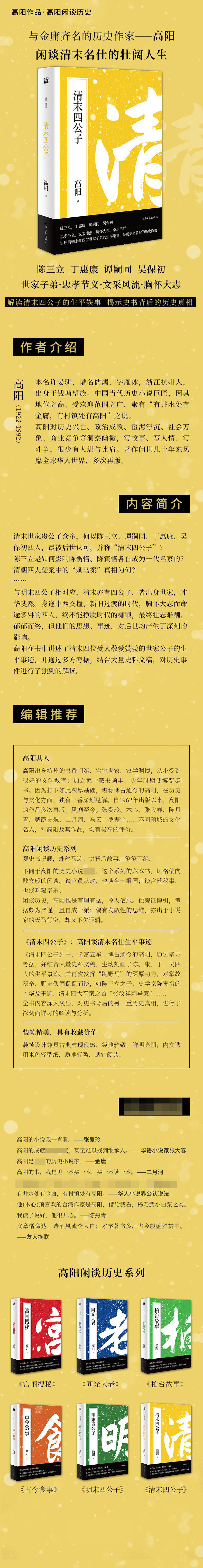 ★高阳其人 高阳出身杭州的书香门第、官宦世家,家学渊博,从小受到很好的文学教育;加之家中藏书颇丰,少年时期便博览群书。因为打下如此深厚基础,堪称博古通今的高阳,在历史与文化方面,独有一番深刻见解。自1962年出版以来,高阳的作品多次再版,风靡至今。张爱玲、木心、张大春、陈丹青、鹦鹉史航、二月河、马云、罗振宇……不同领域的文化名人,对高阳及其作品,均有极高的评价。 ★高阳闲谈历史系列 观史书记载,蛛丝马迹;讲背后故事,滔滔不绝。 不同于高阳的历史小说著作,这个系列的六本书,风格偏向散文般的闲谈。谈官员从政,也谈名士报国;谈宫廷秘事,也谈吃喝享乐。 闲谈历史,高阳也是有理有据,令人信服。他旁征博引,考据颇为严谨,且自成一派;偶有发散性的思维,亦出于小说家的天马行空,却又不失逻辑。 ★《清末四公子》:高阳谈清末名仕生平事迹 《清末四公子》中,学富五车、博古通今的高阳,通过多方考据,并结合大量史料文稿,生动刻画了陈、康、丁、吴四人的生平事迹。并再次发挥“跑野马”的深厚功力,对掌故秘辛、野史佚闻侃侃而谈,如陈三立之子、史学家陈寅恪的才华及事迹、清末四大奇案之首“张汶祥刺马案”…… 全书内容深入浅出,对史书背后的另一重历史真相,进行了深刻而详尽的解读与分析。 ★装帧精美,具有收藏价值 装帧设计兼具古典与现代感,经典雅致,鲜明亮丽;内文选用米色轻型纸,质地轻盈,适宜阅读。