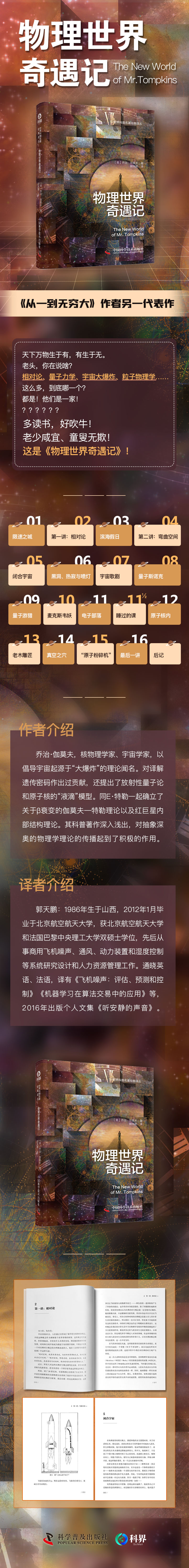 1 限速之城 汤普金斯先生是一家大 银行的小职员,今天是公休 日,他睡到很晚才起床,然 后开始闲适地享用自己的早 餐。“嗯,得好好安排下这 个难得的假期。”他首先想 到的是去看场午后电影。当 他打开晨报,翻到娱乐专栏 ——色情、暴力……这些他 已经看腻了。没有真正的冒 险、没有什么不同寻常、没 有让人激动的影片。汤普金 斯先生努力搜寻着,终究一 无所获,总不能看剩下的少 儿电影吧? 无意间,他的目光落在 小报一角的一则短消息上。 市大学正在举办一系列现代 物理讲座,今天下午的题目 是爱因斯坦的相对论。得! 这个听起来还不错,听人说 ,世界上真正懂得爱因斯坦 理论的人只有一打,说不定 自己凑巧可能就是第13个。 汤普金斯先生决定去听听这 个讲座,或许那正是自己想 要的。 他到的时候,演讲已经 开始了,年轻的学生已经坐 满了学校大礼堂,当然也不 乏大约跟自己一样年纪较大 的听众。讲台上,黑板旁边 站着一个高高的白胡子教授 ,他正在努力地为所有人讲 解着相对论的基本概念。 慢慢地,汤普金斯先生 已然听明白了爱因斯坦理论 的全部要点——任何运动的 物体都无法超越光速。这一 事实会产生一些非常奇怪、 不同寻常的后果。比如,当 运动速度接近于光速时,空 间会被压缩,而时间则会变 慢。当然,教授也说了,光 速高达30万千米每秒,所以 在日常生活中我们很难观察 到相对论效应。 然而在汤普金斯先生看 来,这一切都与常识相悖。 在乔治·伽莫夫笔下,理论物理不仅通俗易懂,而且很有意思。喜欢科普的人不容错过。