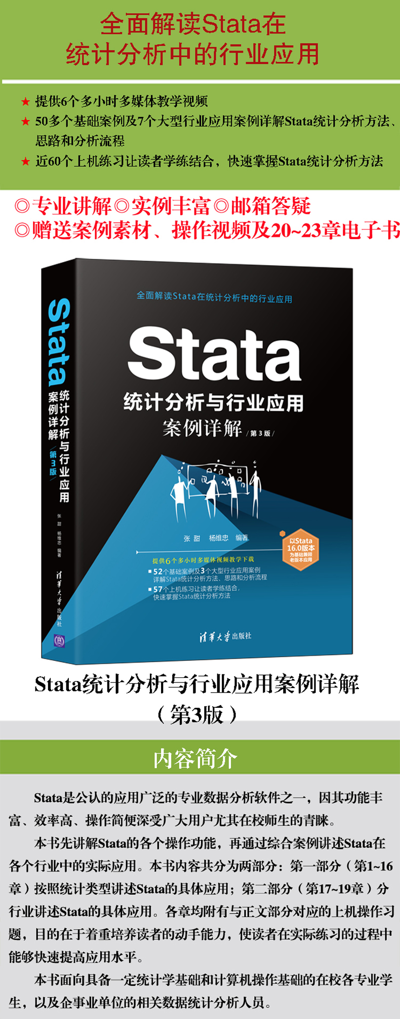 \"提供6个多小时多媒体教学视频 50多个基础案例及7个大型行业应用案例详解Stata统计分析方法、思路和分析流程 近60个上机练习让读者学练结合,快速掌握Stata统计分析方法\"