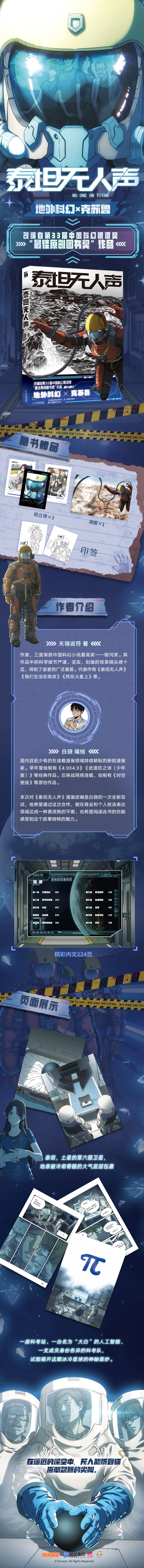 天瑞说符 著 作家,三度荣获中国科幻小说最高奖——银河奖。其作品中的科学细节严谨、坚实,刻画的场景镜头感十足,得到了读者的广泛喜爱。代表作有《泰坦无人声》《我们生活在南京》《死在火星上》等。 白骁 编绘 国内目前少有的在连载漫画领域持续耕耘的新锐漫画家。早年曾绘制有《4.9X4.9》《武道狂之诗(少年版)》等经典作品。后转战网络连载,绘制有《时空使徒》等原创作品。 本次对《泰坦无人声》漫画改编是白骁的一次全新尝试,他希望通过这次合作,能在商业和个人技法表达领域达成一种更成熟的平衡,也希望阅读此书的你能感受到这个故事独特的魅力。