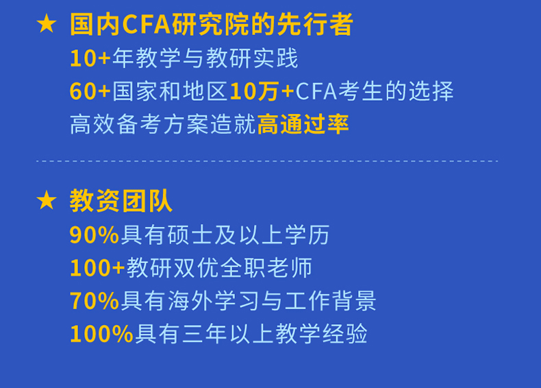 高顿财经研究院CFA?团队历经十余年积累,拥有百余名全职讲师和研究员,其中70%以上具有海外学习与工作背景,90%以上具有硕士及以上学历。众多老师不仅持有CFA?证书,同时还持有FRM、CAIA、CPA等被海内外金融机构广泛认可的财经资格证书。高顿财经研究院CFA?团队已经为全球60多个国家及地区超过10万名CFA?考生提供了高校便捷的CFA?备考解决方案。
