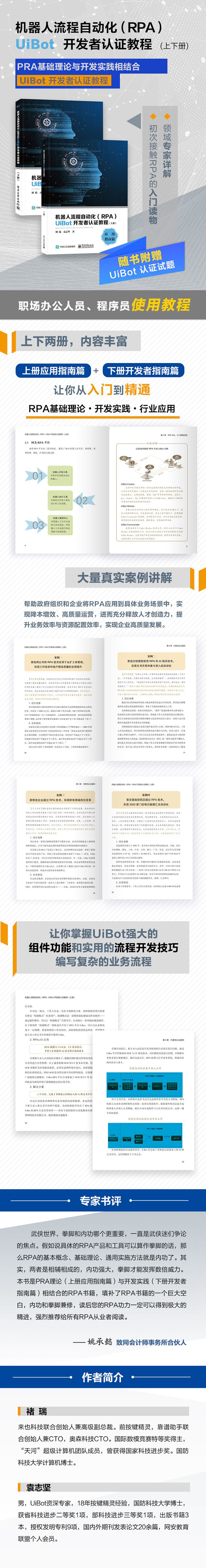 来也科技的UiBot是中国RPA平台型产品的领先者,本书分为上下两册,上册为应用指南篇,下册为开发者指南篇,全面涵盖RPA基础理论、开发实践和行业应用。本书既可作为初次接触RPA的入门读物,也可以作为大中专院校学生、RPA实施人员、运维人员等参加UiBot认证工程师资格考试的教材,对政府公务人员、企业组织决策者、资深CIO等也极具应用参考价值。