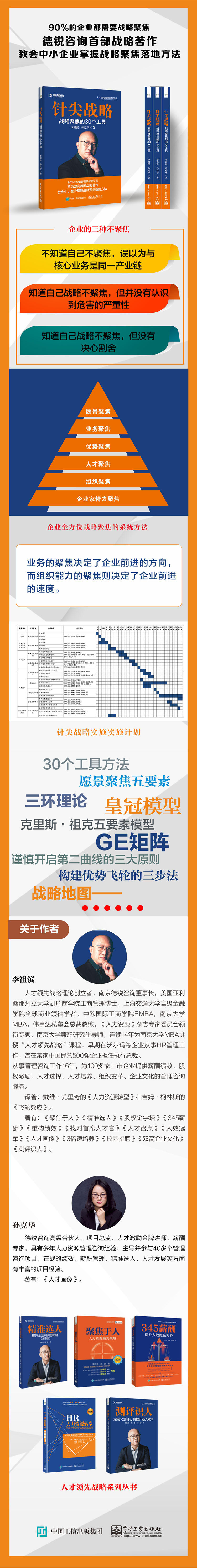 李祖滨人才领先战略理论创立者,南京德锐管理咨询公司董事长,美国亚利桑那州立大学凯瑞商学院工商管理博士DBA,上海交通大学高级金融学院全球商业领袖学者,中欧国际工商学院EMBA,南京大学MBA,伟事达私董会总裁教练,《人力资源》杂志专家委员会领衔专家,南京大学兼职研究生导师,连续14年为南京大学MBA讲授“人才领先战略”课程,早期在沃尔玛等企业从事HR管理工作,曾在中国民营500强担任执行总裁。从事管理咨询工作16年,为100多家上市企业提供薪酬绩效、股权激励、人才选择、人才培养、组织变革、企业文化的管理咨询服务。翻译出版:戴维?尤里奇的《人力资源转型》和吉姆?柯林斯的《飞轮效应》著有书籍:《聚焦于人》《精准选人》《股权金字塔》《345薪酬》《重构绩效》《找对首席人才官》《人才盘点》《人效冠军》《人才画像》《3倍速培养》《校园招聘》《双高企业文化》《测评识人》。孙克华德锐咨询高级合伙人、项目总监、人才激励金牌讲师、薪酬专家。具有多年人力资源管理咨询经验,主导并参与40多个管理咨询项目,在战略绩效、薪酬管理、精准选人、人才发展等方面有丰富的项目经验。著有书籍:《人才画像》。
