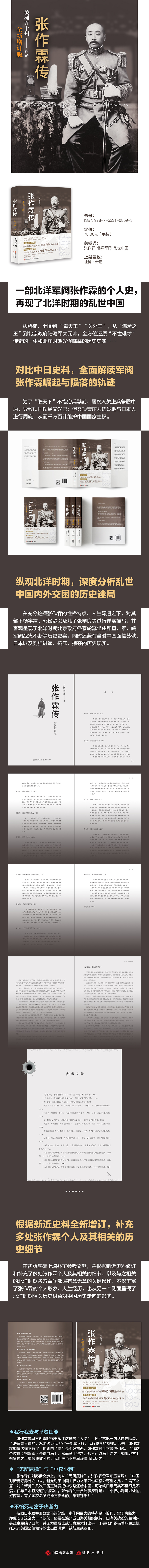 ◆关河五十州作品全新增订版,再现北洋军阀张作霖的个人史:从赌徒、土匪到 “奉天王”“关外王”,从“满蒙之王”到北京政府陆海军大元帅,全方位还原“不世雄才”传奇的一生和北洋时期光怪陆离的历史史实…… ◆对比中日史料,全面解读军阀张作霖崛起与陨落的轨迹;纵观北洋时期,深度分析乱世中国内外交困的历史迷局。 ◆本书如实地描写了张作霖为了“取天下”不惜穷兵黩武,屡次入关进兵争霸中原,导致误国误民又误己的一面,同时也没有忽略他顶着压力巧妙地与日本人进行周旋,从而千方百计维护中国国家主权的一面。 ◆作者在确凿史料的基础上,对张作霖的部下杨宇霆、郭松龄以及儿子张学良等进行了详实的描写,并客观呈现了北洋时期北京政府各系轮流坐庄和直、奉、皖军阀战火不断等历史史实,同时还兼有当时中国面临苏俄、日本以及列强进逼、挤压、掠夺的历史现实。 ◆作者在初版基础上增补了参考文献,并根据新近史料修订和补充了多处张作霖个人及其相关的细节,以及与之相关的北洋时期各方军阀部属在有意无意的关键操作,不仅丰富了张作霖的个人形象、人生经历,也从另一个侧面呈现了北洋时期相关历史纠葛对中国历史走向的影响。
