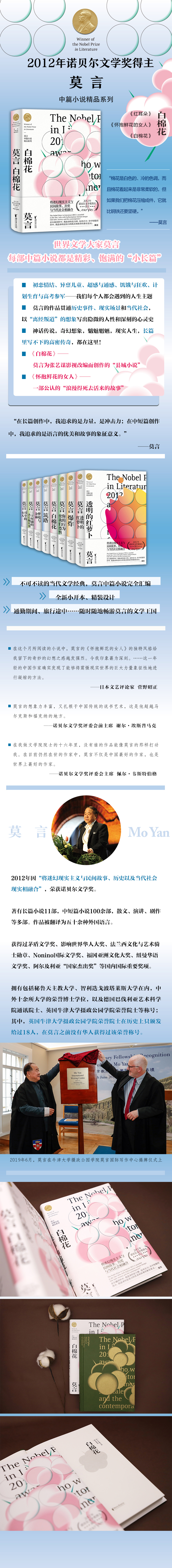 莫言,原名管谟业,山东高密人,1955年2月生。著有《红高粱家族》、《酒国》、《丰乳肥臀》、《檀香刑》、《生死疲劳》、《蛙》等长篇小说十一部,《透明的红萝卜》、《司令的女人》等中短篇小说一百余部,并著有剧作、散文多部;其中许多作品已被翻译成英、法、德、意、日、西、俄、韩、荷兰、瑞典、挪威、波兰、阿拉伯、越南等多种语言,在国内外文坛上具有广泛影响。莫言和他的作品获得过“联合文学奖”(中国台湾),“华语文学传媒大奖·年度杰出成就奖”,法国“Laure Bataillin(儒尔·巴泰庸)外国文学奖”,“法兰西文化艺术骑士勋章”,意大利“NONINO(诺尼诺)国际文学奖”,日本“福冈亚洲文化大奖”,中国香港浸会大学“世界华文长篇小说奖·红楼梦奖”,美国“纽曼华语文学奖”以及中国最高文学奖“茅盾文学奖”。
