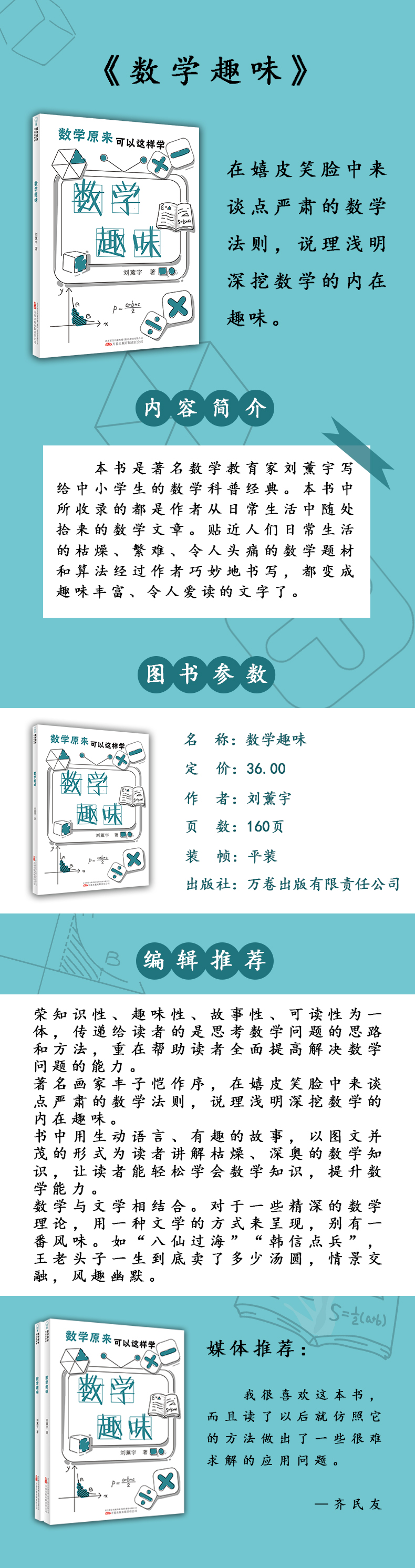 太阳已落下西边去,月亮也唤不起的夜里,在我们眼里所看到的美,不是挂了满天的星吗?有闪烁的,有飞舞的,没有一个人不是用“无数”两个字来表示它们那不能数的多。数学对于这样人不能数的星,却用了几个简单的式子,就能统括起它们运行的路来,依着式子就可决定它们在某时的相关的位置,比用我们的两眼所看的还正确。在海王星没有被发现的时期,因研究关于星的扰动,许多天文学家和亚当斯(Adams)就从数学上决定了它的轨道。当它运行到望远镜可以看着的位置的时候,亚当斯和他的朋友依计算所得的位置将望远镜移转,这从前未被发现而为数学所决定的海王星果然无所逃避,被他们看见了。 这样的例证,虽然多,但都是理科上的运用,一般以数学为理科基础的朋友们当然不否认,别的人难免仍有微辞。单以数学为理科的基础,虽没有大错,却把数学的力量狭看了。 数学在哲学领域以内占有相当的势力,这是从人类的文化略有基础的时候就是这样的。柏拉图(Plato)教他的弟子学哲学,要他们先学几何锻炼思想。毕达哥拉斯(Pythagoras)的哲学更和数学分不了家。其实哲学家不受数学洗礼的真是不易寻出来,读过哲学史的人总不至于以为这话武断吧? 逻辑可当得哲学的基础了,数理逻辑(Mathematical Logic)的创建,更使哲学研究得到了较大的助力,虽然这种研究才在萌芽时代,但“它可以使我们易于研究比‘言词的推论所能得出的’更抽象的观念,它可以指示‘用别的方法想不到’的有效假定,它可以帮助我们立刻看出建筑一个逻辑的或科学的理论,至少需要什么材料”,也见其功不可没了。 1.荣知识性、趣味性、故事性、可读性为一体,传递给读者的是思考数学问题的思路和方法,重在帮助读者全面提高解决数学问题的能力。 2.著名画家丰子恺作序,在嬉皮笑脸中来谈点严肃的数学法则,说理浅明深挖数学的内在趣味。 3.书中用生动语言、有趣的故事,以图文并茂的形式为读者讲解枯燥、深奥的数学知识,让读者能轻松学会数学知识,提升数学能力。 4.数学与文学相结合。对于一些精深的数学理论,用一种文学的方式来呈现,别有一番风味。如“八仙过海”“韩信点兵”,王老头子一生到底卖了多少汤圆,情景交融,风趣幽默。