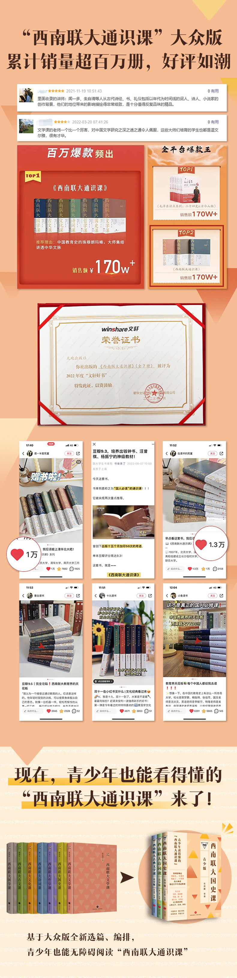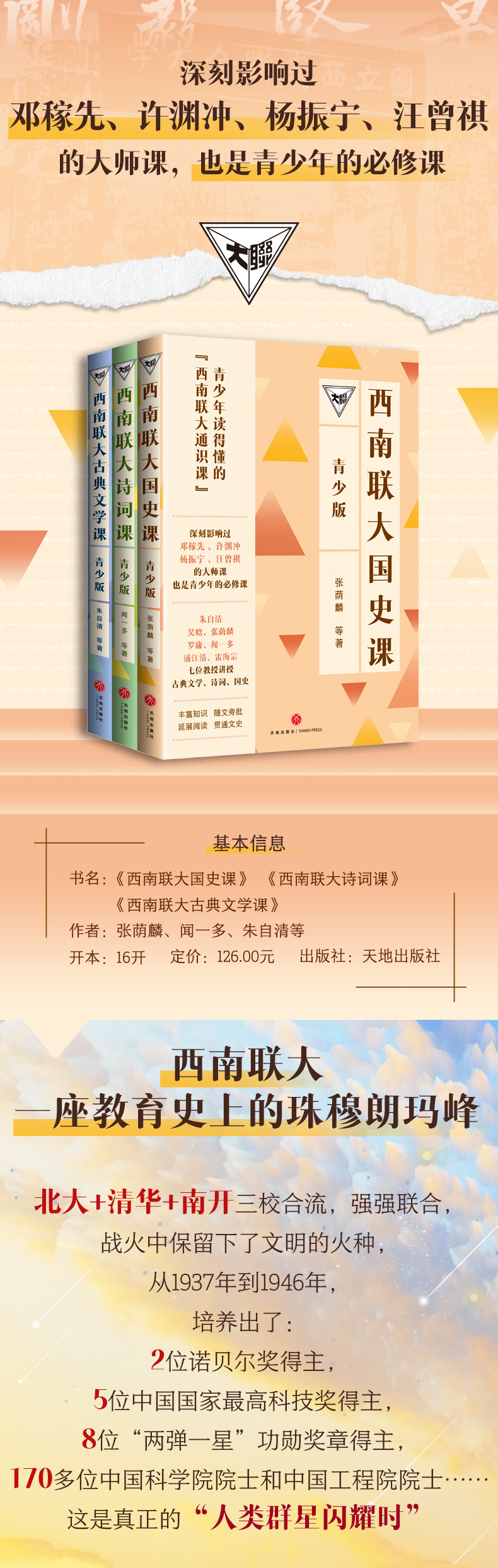 ★大众版累计销量超百万册,好评如潮!深刻影响过邓稼先、许渊冲、杨振宁、汪曾祺的大师课,也是青少年的必修课! ★西南联大,中国教育天花板,一座教育史上的珠穆朗玛峰:仅仅存在8年,却培养出了2位诺贝尔奖得主,5位中国国家最高科技奖得主,8位“两弹一星”功勋奖章得主,170多位中国科学院院士和中国工程院院士…… ★走进西南联大,跟着大师去上课,带领青少年近距离感受顶尖学府的课程含金量! ★三大主题——国史、诗词、古典文学,精心选篇、全新编排,对标新课标教材重点内容,巩固课堂知识。 ★朱自清、吴晗、张荫麟、罗庸、闻一多、浦江清、雷海宗等七位大师,组成豪华讲师天团,让青少年直接接受超强师资力量指导。 ★60堂西南联大通识课,以时间为序,贯通文史,帮助青少年搭建超强、结构化知识体系,学习效果轻松翻倍! ★2000多条旁批,涵盖文史知识和诸多考点,哪里不懂看哪里,无障碍吸收知识。 ★90余篇拓展阅读文章,包含各种古籍文献、诗词、古典文学作品等,原文 译文,原文精校无删改,译文精确通达,帮青少年拓展知识面。 ★少年强则国强:80多年前,他们传道受业,为了走出战火;80多年后,我们薪火相传,为了让明日之中国,站立得更高、更强! ★北大、清华、南开强强联合,战火中铸就中国教育史上的珠穆朗玛峰,也是值得青少年挑战和攀登的高峰! ★百万畅销书的延续,青少年读得懂的西南联大! ★七位大师组成豪华讲师天团,严谨的治学态度,丰富的史料,轻松易懂的语言,用让青少年直接接受超强师资力量指导,家长再也不必担心孩子被网络上良莠不齐、真假难辨的科普误导。 ★让青少年感受自主学习的乐趣,在阅读中掌握自主学习能力;尊重个性与兴趣、鼓励大胆质疑,培养青少年独立人格。 ★60堂西南联大通识课,以时间为序,贯通文史,帮助青少年搭建超强、结构化知识体系,学习效果轻松翻倍! ★选篇内容,即是名家经典,也对标新课标语文、历史教材重点内容,更重视对青少年思维能力的培养。 ★2000多条旁批,涵盖文史知识和诸多考点,哪里不懂看哪里,无障碍吸收知识。 ★90余篇拓展阅读文章,包含各种古籍文献、诗词、古典文学作品等,原文 译文,原文精校无删改,译文精确通达,帮青少年拓展知识面。 ★阅读体验值拉满:国风插图,水墨晕染,画面细处考据严谨,参考古籍、考古文物等绘制;双色印刷,重难点一目了然;装帧精致典雅。