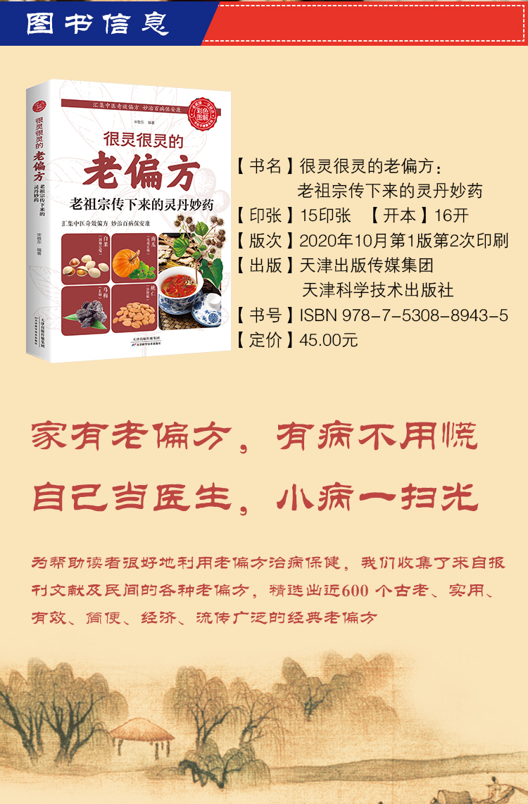 很灵很灵的老偏方:老祖宗传下来的灵丹妙药(生活养生) 出版时间 2024-03-01T00:00 健康课堂 28693 作者: 宋敬东编著 出版社: 天津科技 原售价: 45.00 折扣价: 13.50 折扣购买: 很灵很灵的老偏方:老祖宗传下来的灵丹妙药(生活养生) ISBN: 978753088943501 作者简介 内容简介 上一篇:茶道与茶艺(入门级)下一篇:360度中老年健康管理手册