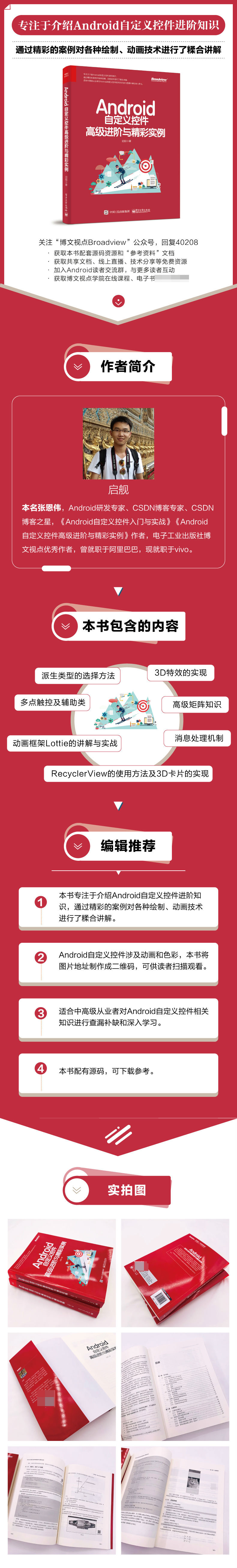 1 本书专注于介绍Android自定义控件进阶知识,通过精彩的案例对各种绘制、动画技术进行了糅合讲解。 2 Android自定义控件涉及动画和色彩,本书将图片地址制作成二维码,可供读者扫描观看。 3 适合中高级从业者对Android自定义控件相关知识进行查漏补缺和深入学习。 4.本书配有源码,可下载参考。