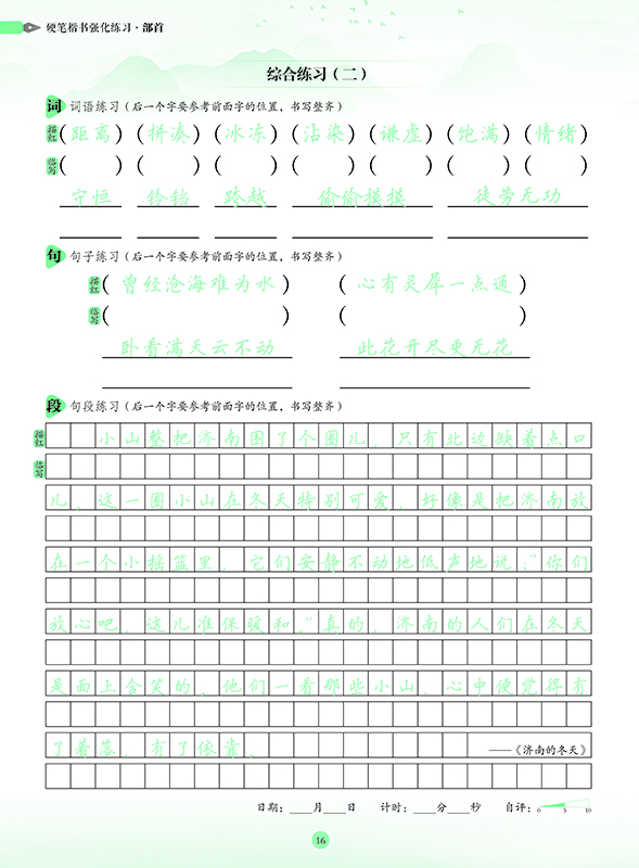 硬笔楷书强化练习部首 出版时间 2024-08-01T00:00 其他类别 8593 作者: 吴玉生| 出版社: 湖北教育 原售价: 20.00 折扣价: 12.40 折扣购买: 硬笔楷书强化练习部首 ISBN: 9787556465002 作者简介 吴玉生,著名书法家。中国教育学会书法教育专业委员会专家组成员,通用语文教材推荐范字书写人,全国九年义务教育《写字》课本规范字书写人,国家语委“汉字行楷手写体字形”科研课题顾问及字形样本书写人。 内容简介 上一篇:病理学习题集/普通高等教育十五国家级规划教材新世纪全国高等中医药院校规划教材配套 下一篇:服装款式设计创意(纺织服装类十四五部委级规划教材)