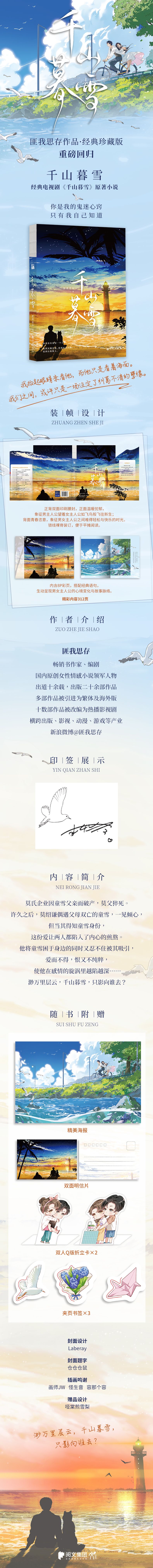 1. 匪我思存作品经典珍藏版重磅回归,经典电视剧《千山暮雪》原著小说。 2. 正背双面印刷腰封,正面温暖忧郁,象征男主人公望着女主人公如飞鸟般飞往新生;背面青春恣意,象征男女主人公之间难得轻松快乐的时光。锁线裸脊装订,便于平摊阅读。 3. 内含8P彩页,搭配经典语句,生动呈现男女主人公的心境变化与故事脉络。 4. 丰富的周边赠品,精美海报、双面明信片、双人Q版折立卡、夹页书签,值得收藏。