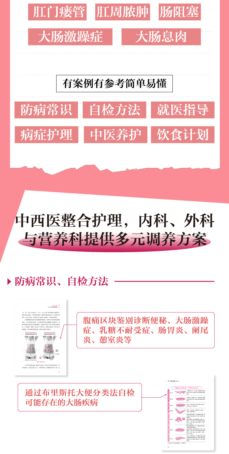 1.肠道组成了人体70%的免疫系统,肠道受损会导致免疫力低下、身体机能衰老、过敏等慢性病,大部分疾病都可以通过肠道治愈,肠道顺一切顺。 2.本书也是市面上少见的由内、外科医生共同编写,且将中、西医观点相结合的肠道健康专书。 3.急性肠胃炎、便秘、腹泻、憩室及憩室炎、大肠激躁症、大肠息肉、痔疮、肛门瘘管、肛周脓肿、肠阻塞等常见病症都囊括,肠胃专科医生告诉您要怎么防、怎么治、怎么调养、怎么吃。 4.防病常识、自检方法、就医指导、病症护理、中医养护、饮食计划,中西医结合,内科、外科与营养科提供多元调养方案。