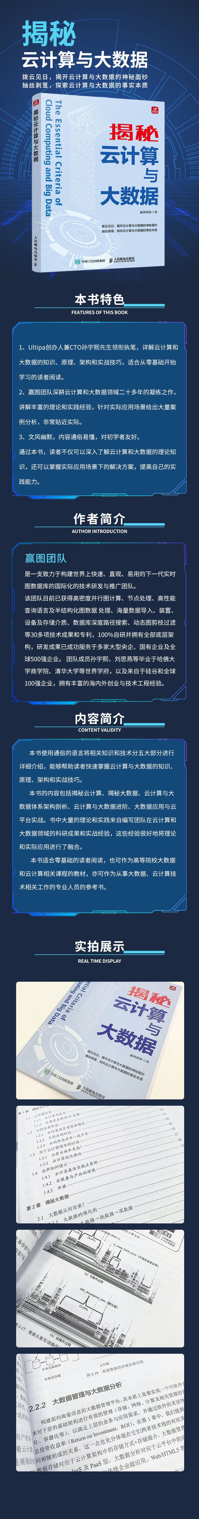 1、Ultipa创办人兼CTO孙宇熙先生领衔执笔,详解云计算和大数据的知识、原理、架构和实战技巧,适合从零基础开始学习的读者阅读。 2、赢图团队深耕云计算和大数据领域二十多年的凝练之作,讲解丰富的理论和实践经验,针对实际应用场景给出大量案例分析,非常贴近实际。 3、文风幽默,内容通俗易懂,对初学者友好。通过本书,读者不仅可以深入了解云计算和大数据的理论知识,还可以掌握实际应用场景下的解决方案,提高自己的实践能力。