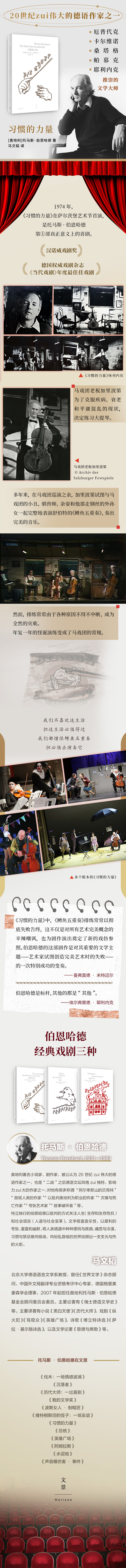 作者简介: 托马斯·伯恩哈德(Thomas Bernhard,1931—1989) 奥地利著名小说家、剧作家,被公认为20世纪最伟大的德语作家之一,也是“二战”之后德语文坛风格最独特、影响力最大的作家之一,对他有很多称谓:“阿尔卑斯山的贝克特”“敌视人类的作家”“以批判奥地利为职业的作家”“灾难与死亡作家”“夸张艺术家”“故事破坏者”等。 特立独行的伯恩哈德以批判的方式关注人生(生存和生存危机)和社会现实(人道与社会变革)。文字极富音乐性,以犀利的夸张、重复和幽默,将人类境遇中种种愚钝与疾病,痛苦与冷漠,习惯与禁忌推向极端,向纷乱昏暗的世界投掷出一支支光与热的火炬。 译者简介: 北京大学德语语言文学系教授,曾任《世界文学》杂志顾问,中国外文局翻译专业资格考评中心专家,德国格里美豪森学会理事,2007年起担任奥地利托马斯·伯恩哈德基金会顾问委员会委员。主要论著有《瑞士德语文学史》等。主要译著有小说《黑白天使》《历代大师》,戏剧《纵火犯》《骂观众》《英雄广场》,诗歌《傅立特诗选》《萨拉·基尔施诗选》,以及文学论著《歌德与席勒》等。