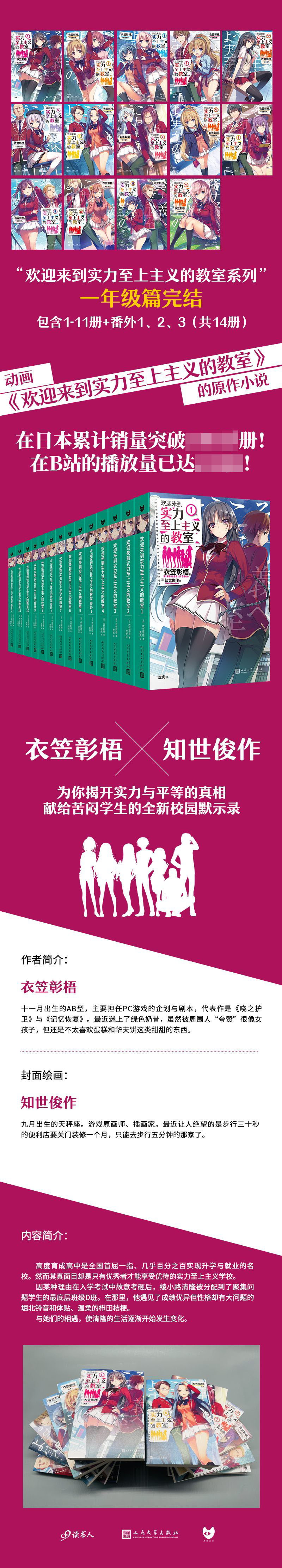 欢迎来到实力至上主义的教室(全3册,番外1-3) 出版时间 2021-10-01T00:00 其他类别 19604 作者: 衣笠彰梧 出版社: 人民文学 原售价: 139.00 折扣价: 86.20 折扣购买: 欢迎来到实力至上主义的教室(全3册,番外1-3) ISBN: 978702016006801 作者简介 衣笠彰梧,日本剧作家、小说家。主要担任PC游戏的企划与剧本。代表作是《晓之护卫》系列。2012年以《小恶魔缇莉与救世主!?》在轻小说界出道。 内容简介 动画《欢迎来到实力至上主义的教室》的原作小说。 上一篇:调研理论与操作实务(共3册)下一篇:中国现当代文学研究文库-新时代文学:走向人民与美