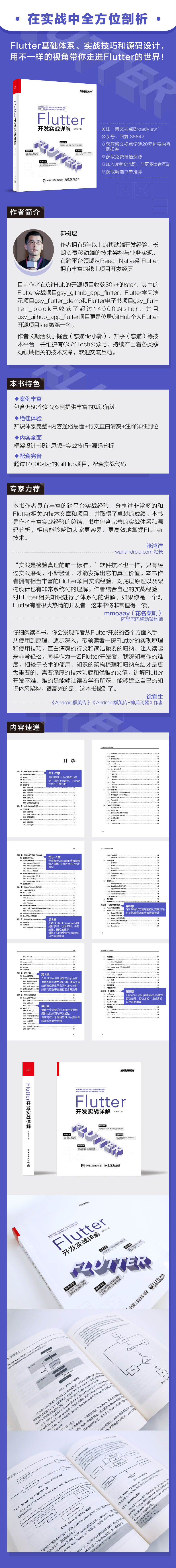 郭树煜 作者拥有5年以上的移动端开发经验,长期负责移动端的技术架构与业务实现,在跨平台领域从 React Native到Flutter拥有丰富的线上项目开发经历。 目前作者在GitHub的开源项目收获30k+的star,其中的Flutter实战项目gsy_github_app_flutter、Flutter学习演示项目gsy_flutter_demo和Flutter电子书项目gsy_flutter_book已收获了超过14000的star,并且gsy_github_app_flutter项目更是位居GitHub个人Flutter开源项目star数第一名。 作者长期活跃于掘金(恋猫de小郭)、知乎(恋猫)等技术平台,并维护有GSYTech公众号,持续产出着各类移动领域相关的技术文章,欢迎交流互动。
