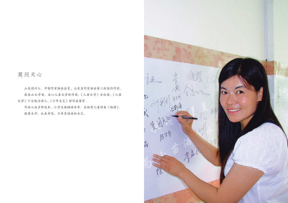莫问天心:山东德州人。中国作家协会会员,山东省作家协会第三批签约作家。 获泰山文学奖、冰心儿童文学新作奖、《儿童文学》金近奖、《儿童文学》十大魅力诗人、《少年文艺》好作品奖等。作品入选多种选本、小学生教辅读本等。出版有儿童诗集《翅膀》。敬畏文字,认真书写,不辜负读者和自己。