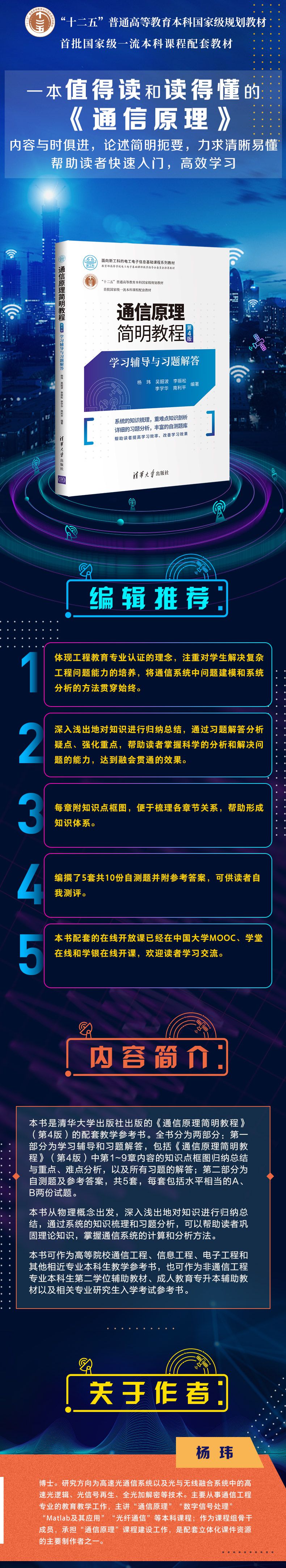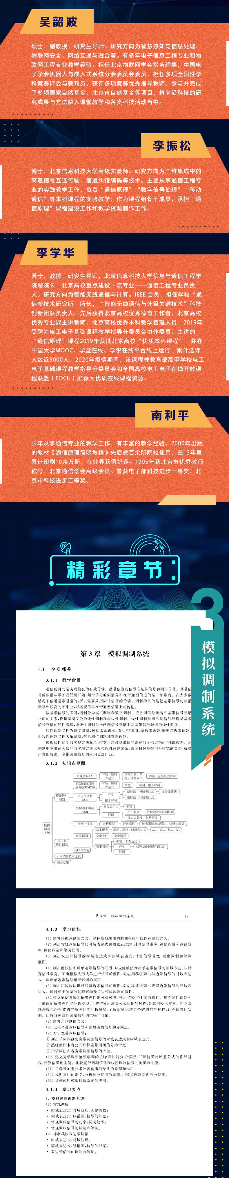 \"杨玮:博士,北京信息科技大学教师。研究方向为高速光通信系统以及光与无线融合系统中的高速光逻辑、光信号再生、全光加解密等技术。主要从事通信工程专业的教育教学工作,主讲“通信原理”“数字信号处理”“MATLAB及其应用”“光纤通信”等本科课程;作为课程组骨干成员,承担“通信原理”课程建设工作,是配套立体化课件资源的主要制作者之一。 吴韶波:硕士,北京信息科技大学副教授、研究生导师。研究方向为智慧感知与信息处理、物联网安全、网络互通与融合等。有多年电子信息工程专业和物联网工程专业教学经验。担任北京物联网学会常务理事,中国电子学会机器人与嵌入式系统分会委员会委员,担任多项全国性学科竞赛评委与裁判员,获评多项竞赛优秀指导教师。参与并完成国家自然基金、北京市自然基金等项目,将前沿科技的研究成果与方法融入课堂教学和各类科技活动当中。 李振松:博士,北京信息科技大学高级实验师。研究方向为三维集成中的高速信号互连传输、信道纠错编码等技术。主要从事通信工程专业的实践教学工作,负责“通信原理”“数字信号处理”“移动通信”等本科课程的实验教学;作为课程组骨干成员,承担“通信原理”课程建设工作和教学资源制作工作。 李学华:博士,北京信息科技大学教授、研究生导师,信息与通信工程学院副院长,北京高校重点建设一流专业——通信工程专业负责人。研究方向为智能无线通信与计算。IEEE 会员,担任学校“通信新技术研究所”所长,“智能无线通信与计算关键技术”科技创新团队负责人。先后获得北京高校优秀德育工作者、北京高校优秀专业课主讲教师、北京高校优秀本科教学管理人员,2019年受聘为电工电子基础课程教学指导分委员会协作委员。主讲的“通信原理”课程2019年获批北京高校“优质本科课程”,2020年获批首批国家级一流本科课程,并在中国大学MOOC、学堂在线、学银在线平台线上运行,累计选课人数近5000人。2020年疫情期间,该课程被教育部高等学校电工电子基础课程教学指导分委员会和全国高校电工电子在线开放课程联盟(EOCU)推荐为优质在线课程资源。 南利平:长年从事通信专业的教学工作,有丰富的教学经验。2000年出版的教材《通信原理简明教程》先后被百余所院校使用,在13年里累计印刷10余万册,在业界获得好评。1995年获北京市优秀教师称号,北京通信学会高级会员。曾获电子部科技进步一等奖、北京市科技进步二等奖。 \"