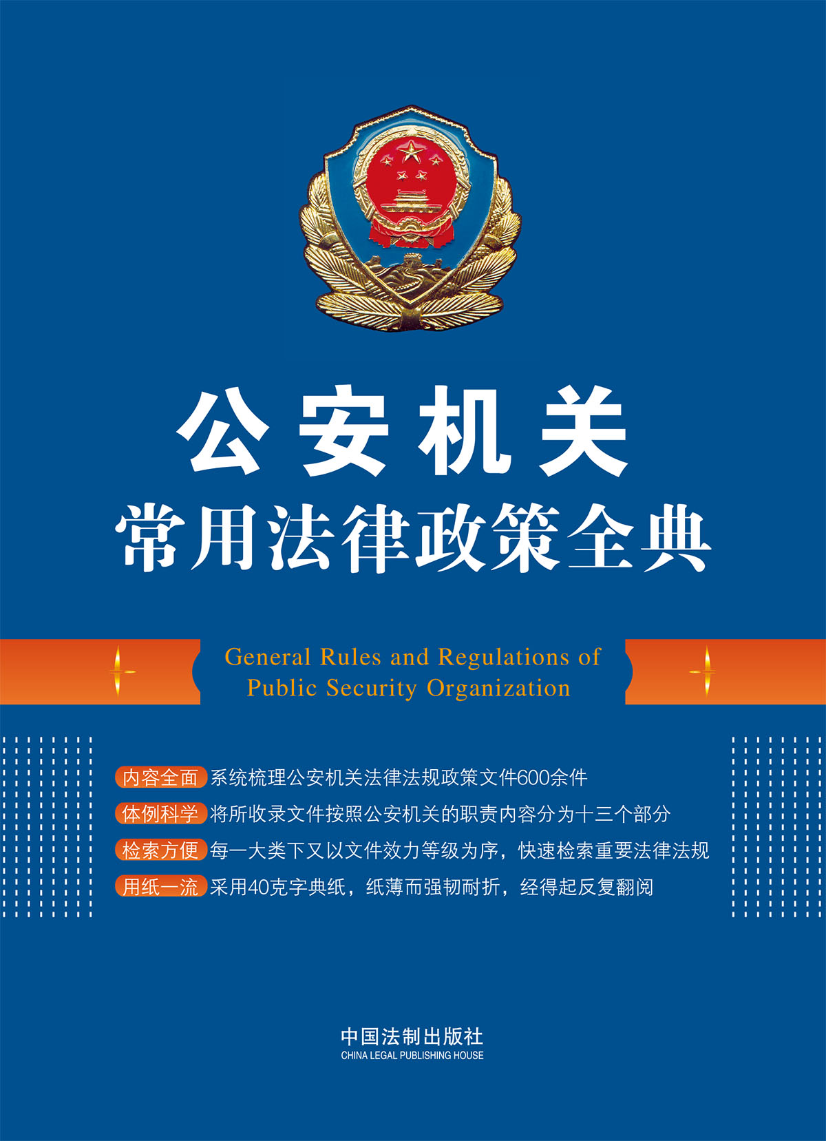 **条为了维持社会秩序,保护公民的权利和利益,服务于***建设,制定本条例。 第二条中华人民共和国公民,都应当依照本条例的规定履行户口登记。 现役**的户口登记,由*事机关按照管理现役**的有关规定办理。 居留在中华人民共和国境内的外国人和无国籍的人的户口登记,除法令另有规定外,适用本条例。 第三条户口登记工作,由各级公安机关主管。 城市和设有公安派出所的镇,以公安派出所管辖区为户口管辖区;乡和不设公安派出所的镇,以乡、镇管辖区为户口管辖区。乡、镇人民委员会和公安派出所为户口登记机关。 居住在机关、团体、学校、企业、事业等单位内部和公共宿舍的户口,由各单位**专人,协助户口登记机关办理户口登记;分散居住的户口,由户口登记机关直接办理户口登记。 居住在*事机关和**宿舍的非现役**的户口,由各单位**专人,协助户口登记机关办理户口登记。 农业、渔业、盐业、林业、牧畜业、手工业等生产合作社的户口,由合作社**专人,协助户口登记机关办理户口登记。合作社以外的户口,由户口登记机关直接办理户口登记。 第四条户口登记机关应当设立户口登记簿。 城市、水上和设有公安派出所的镇,应当每户发给一本户口簿。 农村以合作社为单位发给户口簿;合作社以外的户口不发给户口簿。 户口登记簿和户口簿登记的事项,具有证明公民身份的效力。 第五条户口登记以户为单位。同主管人共**住一处的立为一户,以主管人为户主。单身居住的自立一户,以本人为户主。居住在机关、团体、学校、企业、事业等单位内部和公共宿舍的户口共立一户或者分别立户。户主负责按照本条例的规定申报户口登记。 第六条公民应当在经常居住的地方登记为常住人口,一个公民只能在一个地方登记为常住人口。 第七条婴儿出生后1个月以内,由户主、亲属、抚养人或者邻居向婴儿常住地户口登记机关申报出生登记。 弃婴,由收养人或者育婴机关向户口登记机关申报出生登记。 内容全面 系统梳理公安机关法律法规政策文件 体例科学 将所收录文件按照公安机关的职责内容分为十三个部分 检索方便 每一大类下又以文件效力等级为序,快速检索重要法律法规 用纸** 采用40克字典纸,纸薄儿而强韧耐折,经得起反复翻阅
