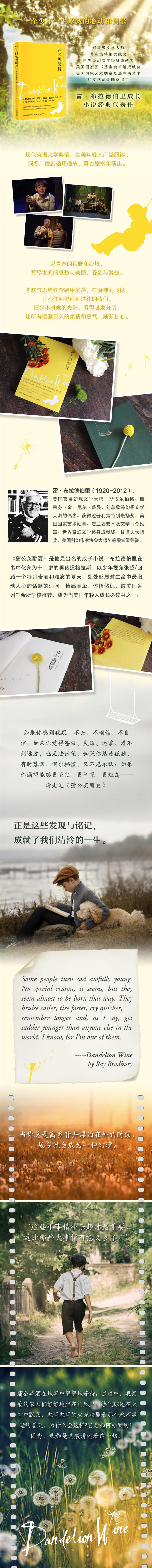 雷·布拉德伯里(1920-2012),美国著名幻想文学大师,刘慈欣、斯皮尔伯格、斯蒂芬·金的文学施益人。他先后赢得了世界奇幻文学终身成就奖、甘道夫大师奖、布莱姆·斯托克终身成就奖、美国科幻作家协会大师奖等殿堂级荣誉。 布拉德伯里的作品文笔优美,富有诗意与哲思,在主流文学界引起了巨大反响,他也因此被视为\"\"将现代科幻领入主流文学领域的最重要人物\"\"。2000年获得美国国家图书基金会卓越成就奖。2004年,时任美国总统小布什为布拉德伯里颁发了美国国家艺术勋章。2007年他又以小说家的身份获得了普利策特别褒扬奖和法兰西艺术及文学司令勋章。 2012年6月5日,雷·布拉德伯里以91岁高龄病逝于洛杉矶。时任美国总统巴拉克·奥巴马在悼词中称赞\"\"他的叙事才华重塑了我们的文化,拓展了我们的世界\"\"。 布拉德伯里代表作品有《蒲公英醇夏》《华氏451》《火星纪事》等,其中《蒲公英醇夏》是他以少年视角写成的一部成长小说,讲述了道格拉斯在夏季短暂的三个月时光里的所见所闻和所想,处处彰显着对生命中激动人心的话题的追问,语言优美动人,情感真挚,被美国各州学校普遍推荐书目。