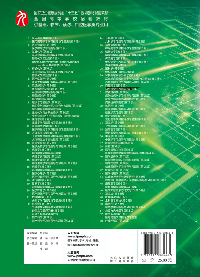 本书为全国高等学校五年制本科临床医学专业第九轮规划教材的配套教材。《学习指导与习题集》类配套教材的编制,有利于学生掌握教材的重点、难点,起到教学大纲的作用;又可使学生对课堂知识进行复习、练习,加深对课堂知识的了解和掌握;同时,配套教材还可以将课堂中因为学时限制而不能详细讲解的内容进行扩展学习。 本书为五年制本科临床医学专业规划教材《口腔科学》(第9版)的配套教材《学习指导与习题集》,主要包含学习目标、习题及参考答案等几部分内容。本配套教材是根据新版《口腔科学》的相关内容进行编写,贴近执业医师资格考试,进一步加强对学生学习本课程和今后进行执业医师考试的指导和辅助作用。 口腔科学-医学院校-教学参考资料