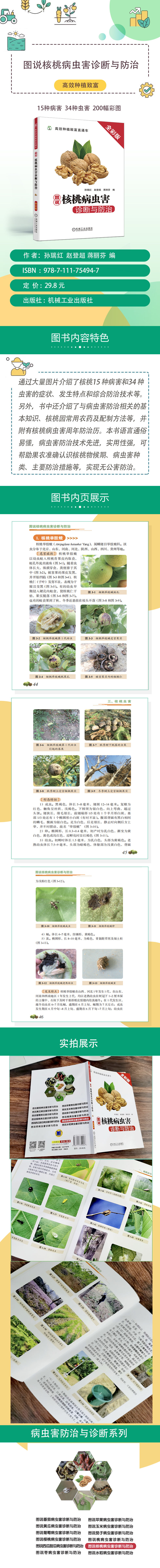 *近200 幅彩色图片,介绍核桃15 种病害和34 种虫害的症状、发生特点和综合防治技术,手把手教你提高核桃种植效益; *编写形式新颖,采取图、表、文结合的方式,穿插重点、难点、窍门或提示等小栏目,通俗易懂,实操性强; *为提高技术的可借鉴性,书中配有种植能手的实例介绍,以便于核桃种植者之间的交流和学习; *介绍了与病虫害防治相关的基本知识、核桃园常用农药及配制方法等,并附有核桃病虫害周年防治历,帮助种植户实现核桃园病虫害无公害防治。