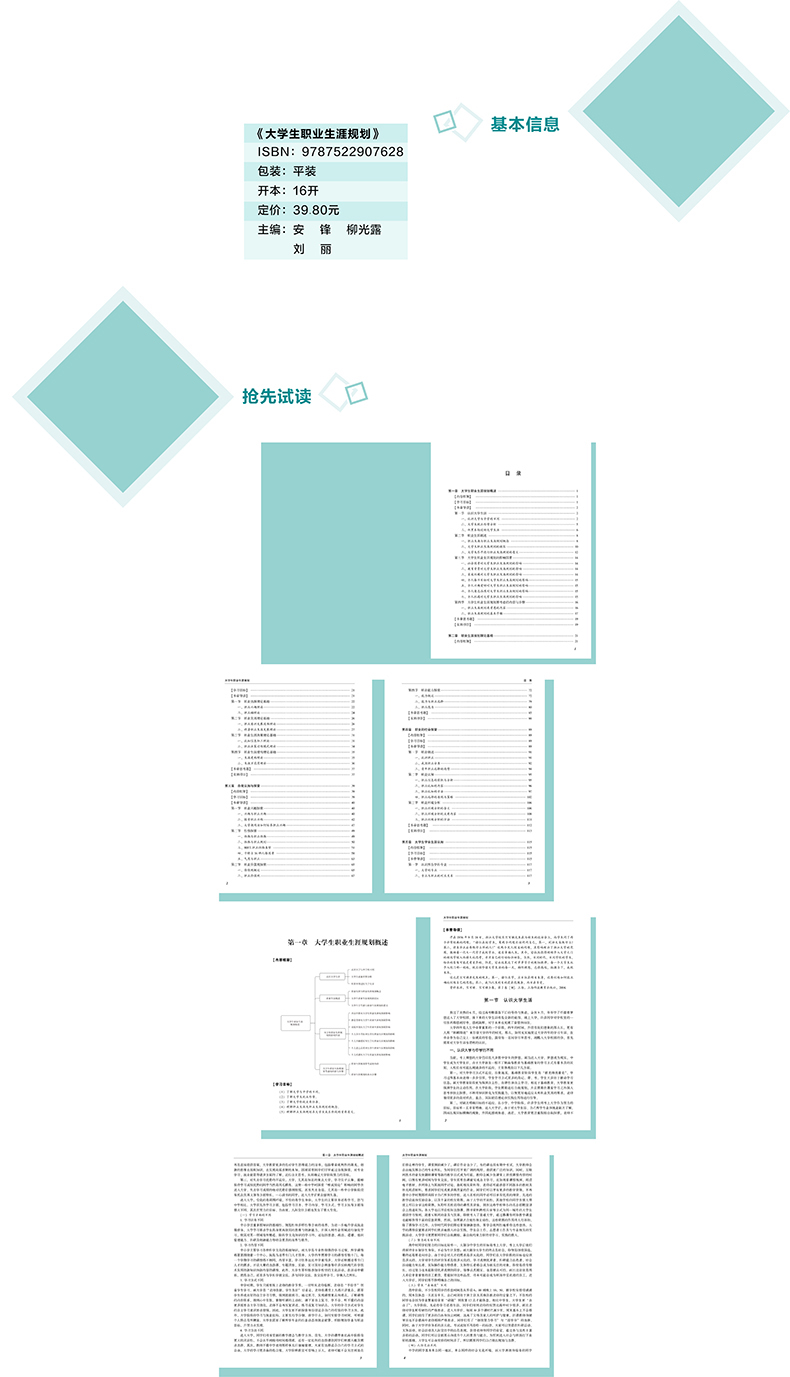 安锋,辽宁科技大学创新创业学院副教授。一直从事人力资源管理、企业管理方面工作与研究。具有十余年企业人力资源管理工作经验。作为主编及副主编编写并出版《鞍钢企业文化教程》《人力资源管理教程》《现代企业管理》《大学生职业生涯规划》等教材十余部,擅长职业生涯规划指导、人力资源管理问题咨询及创新创业实践指导。擅长指导大学生创新创业实践活动,在国家级、挑战杯等多项重磅大赛中多次获奖,并多次荣获大赛优秀指导教师。刘丽,辽宁科技大学创新创业学院教授,研究生导师,波兰罗兹理工大学博士后,毕业于辽宁大学企业管理专业。研究方向为职业规划、创业管理等。国家级创新创业导师,辽宁省青年教育科研骨干,辽宁科技大学“钢苑桥”学业职业生涯指导工作室骨干教师,多年来主讲《职业生涯规划》《创业管理》《创新教育》等课程。出版专著1部,译著1部,主编教材4部,发表学术论文50余篇,指导学生参加学科竞赛获得省级以上奖励100余项,曾多次荣获辽宁省“挑战杯”大学生课外学术作品等大赛优秀指导教师,鞍山市优秀青年岗位能手、鞍山市园丁创业能手,辽宁科技大学优秀教师,辽宁科技大学学生最喜爱教师等荣誉称号。柳光露,辽宁科技大学创新创业学院讲师,研究方向为旅游产业经济、旅游教育、创新创业教育等。第一作者发表包含SCI、EI、CSSCI(扩展)、中文核心、教研性等论文20余篇;参与编写《创业管理》《职业生涯规划》《旅游规划与开发》《应用文写作》等多本教材。获奖信息:首席指导学生参加省A级(含省A级)以上竞赛10余次,获得省级二等奖3次,三等奖1次,并获得优秀指导教师称号;获得校级各类教学大赛奖励3次(含二等奖2次,三等奖1次);多次获得毕业论文优秀指导教师奖励;于2021年度获得“最喜爱教师”称号。