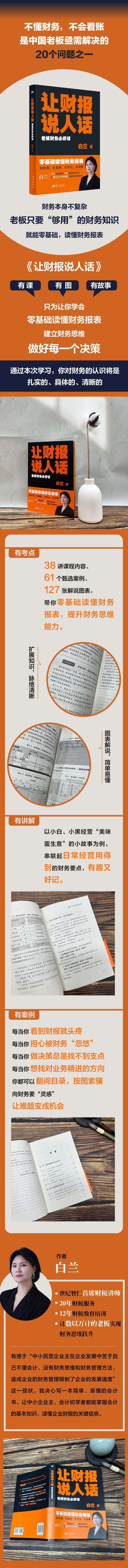 让财报说人话:老板财务必修课 出版时间 2024-03-01T00:00 其他类别 99193 作者: 白兰 出版社: 东方 原售价: 68.00 折扣价: 46.30 折扣购买: 让财报说人话:老板财务必修课 ISBN: 9787520737715 作者简介 白兰 中国注册会计师、税务师。 多年会计院校一线教学经验,20年中小民营企业财税工作经验。深谙中小民营企业财务管理现状。 有感于“中小民营企业主在企业发展中苦于自己不懂会计、没有财务思维和财务管理方法,造成企业的财务管理限制了企业的发展速度”这一现状,决心写一本简单、易懂的会计书,让中小企业主、会计初学者都能掌握会计的基本知识,读懂企业财报的关键信息。 内容简介 上一篇:BPMN 2.0――业务流程建模标准导论(第二版)下一篇:单身女孩在北京