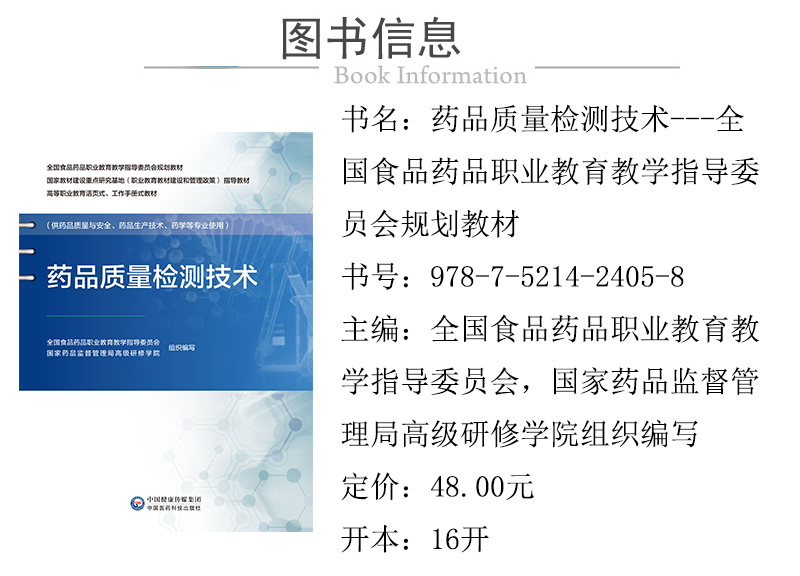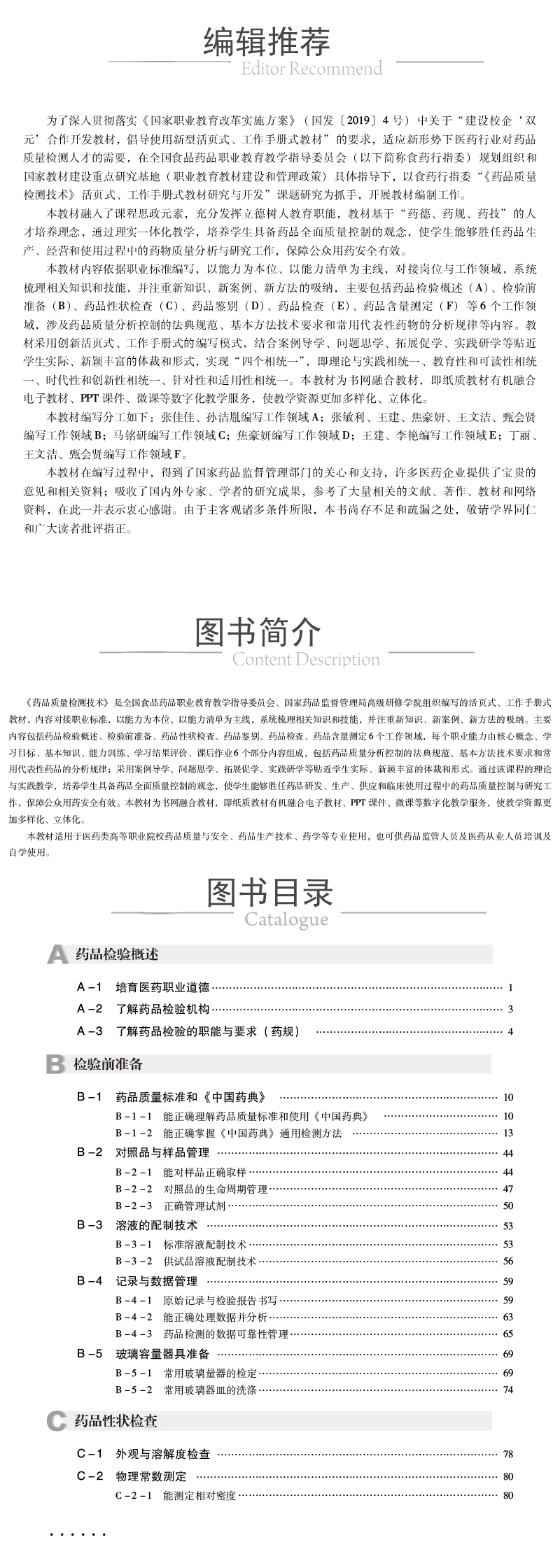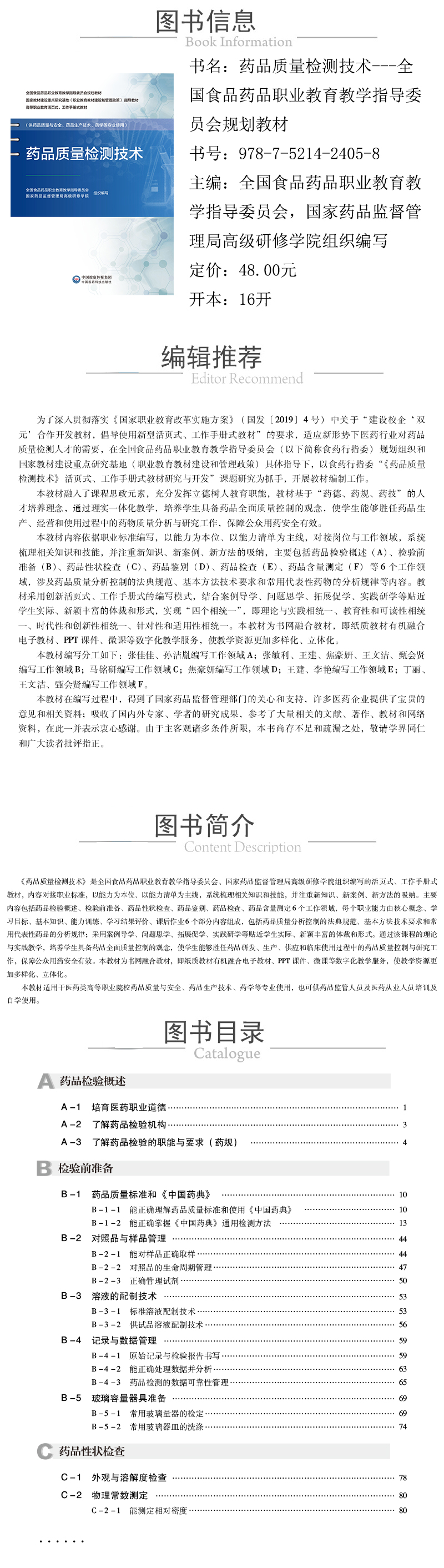 药品质量检测技术(供药品质量与安全药品生产技术药学等专业使用高等职业教育活页式工 出版时间 2021-08-01T00:00 其他类别 67370 作者: 编者:张佳佳//王建|责编:赵敏 出版社: 中国医药科技 原售价: 48.00 折扣价: 31.60 折扣购买: 药品质量检测技术(供药品质量与安全药品生产技术药学等专业使用高等职业教育活页式工 ISBN: 9787521424058 作者简介 内容简介 上一篇:在我的开放式工位下一篇:会计基础(第二版)