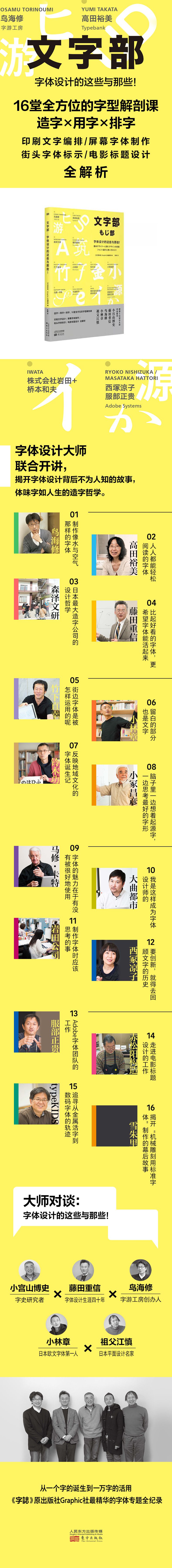已经无法再做正文字体了吗? 祖父江—出席这次座谈会的各位,都是长期活跃在字体设计、字库制作领域里的名人,同时又是东京TDC奖“字体设计奖”的评审成员,我想应该可以说是洞悉文字的过去、现在、未来的吧。东京TDC奖的参与者有很多都是年轻的设计师,各位对于最近的投稿作品有什么感想吗? 小宫山—西文字体中,有很多投稿是正统的正文字体。相对来说,日文的正文字体在大幅减少,取而代之的是标题类字体,也就是说以装饰为目的的字体很多。 鸟海—正文字体确实很少啊。 小宫山—我觉得,这也如实反映了欧美国家和日本对于字体设计看法的差异。现在日本有大约2000款标题字体,再加上那些免费字体,数量就更多了,也许有5000款左右。我是不太想说别人的坏话,但不得不说,这些大多都是没有也无所谓的。 鸟海—好严格啊。 小宫山—不过,你也是这么想吧?这些字体不过是让字体目录看上去更丰富而已。从历史发展来看,基本都不怎么会被用到,就自然消失了。反而是那些正统的正文字体越来越难以制作。或者说字体设计师无法制作这类字体的状况正在延续。至少我是有这种印象。 祖父江—原来如此啊…… 小宫山—范围说得大一些的话,活字字体——我把数码字体统称为“活字字体”——是传播这个国家的文化、思想、技术的。换个说法,就是能承担这个任务的才能叫字体。基于某些目的而设计的也是字体,但对于标题字体,完全看不到最关键的目的性。我觉得这对于字体设计并不是好事。 祖父江—这会是暂时的潮流吗? 小宫山—不知道。如果是暂时的倒好了,但在不远的未来,这样的趋势也许会持续一段时间。不过,说到底这也只是我的个人印象。反过来我其实很想知道,其他字体设计师或者平面设计师是怎么想的。 藤田—小宫山先生说得在理,我觉得原则上是正确的。但另一方面,字体使用者也会有一些他们的需求。我 在字体制作公司工作,所以几乎每天都会听到客户反馈的声音。小宫山先生所批判的标题字体,大家反而是希望越多越好。当然,抓眼球的标题字体是随着时代的变化,开发、消失、再开发、再消失……这样循环往复吧。 小宫山—嗯,难以流传下去。 藤田—从另一个角度看的话,也可以说是敏感地反映了时代风潮吧。不仅有夏目漱石那样伟大的小说家,在各自的时代备受关注的畅销书作家也是有必要存在的。从丰富时代的角度来看。 鸟海—我的想法和小宫山先生类似。字游工房的方针就是“制作基本款字体”,所以就一直有想要增加这类字体的念头。比如书籍设计师平野甲贺就曾向我强烈要求说:“做个能用一百年的字体吧!”我本人也希望如此。不过,藤田先生说的道理,我也是非常理解的。但我还是希望,制作基础款字体、正统字体的人再多一些就更好了。 小宫山—你说的不仅仅限于东京TDC奖吧? 鸟海—是啊,在日文字体设计的世界里,我常这么想。最近“森泽字体大赛”(新名称为“森泽字体设计评选”)又重新举办了。这本来是非常令人高兴的事情,但遗憾的是,不太能感受到人们对正文字体的关注度。 祖父江—因为制作正文字体是比较麻烦的事吧? 鸟海—与其说是麻烦,还不如说有很多人觉得没什么必要吧。也就是说,可能大家都觉得现有的正文字体就足够了。 祖父江—也许这不是字体设计大赛相关者的想法,而是在字体设计界自然而然形成的一种感觉? 鸟海—是的。这么一想,就会再次让我觉得……还有很多值得字游工房去做的事啊。 字体设计要有工匠精神,如何尊重原创又加入新意? 从单字到整体,字体排布如何呈现氛围感? 中日韩字型各自为政,字体如何表达,才能找到众人都认同的表情? 一款字体可能优雅如和服女子,可能陈旧似发霉,如何设计出有表情的文字? 用于警示的字体、用于引导的字体,如何设计才能表现街头字体的功能? 留白处也是文字,如何利用空白来让作品完美? 文字时时在我们的日常生活中,如何设计自己的地域文字? ……… 本书向我们揭开字体设计背后不为人知的故事。 是平面设计师、字体设计专业学生、字体爱好者不可多得的设计美学读本。 …………………………………………………………………………………………………………………………………………….. 全方位的字型解剖书:包括印刷文字设计、屏幕字体制作、街头字体标示、电影标题设计。 大师级字体设计师联合开讲:鸟海修、藤田重信、马修·卡特、西塚良子、高田裕美、大曲都市、小林章、铃木功、竹下直幸、服部正贵、赤松阳构造、今田欣一 大师对谈精华:小宫山博史(字体史研究者)×藤田重信(字体设计生涯四十年)×鸟海修(字游工房创办人)×小林章(日本欧文字体第一人)×祖父江慎(日本平面设计名家)