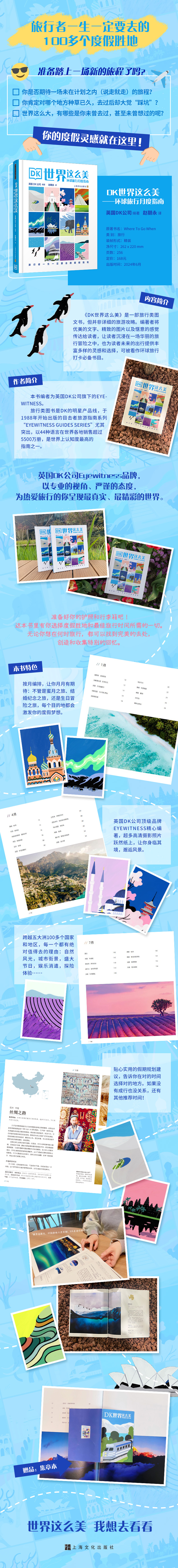 最city的旅行打卡之书!激发度假灵感,唤醒旅行渴望,遇见全球一百多处绝美风景,即刻出发!穿越四季,邂逅全球绝美!《DK世界这么美》——你的环球旅行灵感宝典,一册在手,说走就走! 英国DK公司Eyewitness品牌,以专业的视角、严谨的态度,为热爱旅行的你呈现最真实、最精彩的世界。 准备好你的护照和行李箱吧!这本书里有你选择度假胜地和最佳旅行时间所需的一切。无论你想在何时旅行,都可以找到完美的去处,创造和收集特别的回忆。 ? 按月编排,让你月月有期待:不管是蜜月之旅、结婚纪念之旅,还是生日冒险之旅,每个目的地都会激发你的度假梦想。 ? 英国DK公司顶级品牌Eyewitness精心编著,超多高清摄影照片跃然纸上,让你身临其境,邂逅风景。 ? 跨越五大洲100多个国家和地区,每一个都有绝对值得去的理由:自然风光,城市街景,盛大节日,娱乐消遣,探险体验…… ? 贴心实用的假期规划建议,告诉你在对的时间选择对的地方。如果没有成行也没关系,还有其他推荐时间!