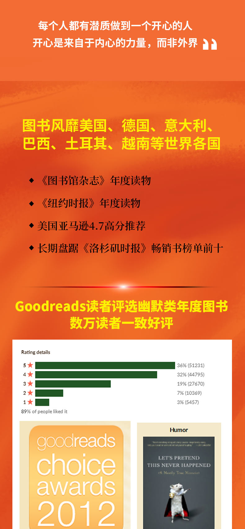 1. 该书是《高兴死了!!!》畅销书作者珍妮·罗森出道文坛的处女作,作为首部作品,其内容更加饱满多样。 本书90%的故事是真实的,作者从小被抑郁症、焦虑症所困扰,但是她以非常幽默的笔触写下了这一切,让我们明白,每个人都有潜质做到一个开心的人。开心是来自于内心的力量,而非外界。 2.《纽约时报》《图书馆杂志》年度读物,长期盘踞《洛杉矶时报》畅销书榜单前十。图书风靡美国、德国、意大利、巴西、土耳其、越南等世界各国。 《开心坏了》在国外长期盘踞各大畅销书榜单,被《纽约时报》和《图书馆杂志》评为年度ZUI佳读物。图书版权更是畅销至德国、意大利、巴西、越南等世界各国,受到世界范围内读者的欢迎和喜爱。 3.《书单》《科克斯书评》《人物》等国外重磅媒体一致盛赞,各大畅销书作者鼎力推荐。 一本史上ZUI为搞笑的回忆录。它记录了一只会说话的松鼠、焦虑障碍、沙发礼节等等,不一而足。相信我们说的没错,珍妮令人捧腹。 ——《淑女之家报》 滑稽有趣,口无遮拦,却又出乎意料地振奋人心……不等读完《开心坏了》这本书,你就会期待珍妮的下一本书,而且希望马上就能够读到。 ——《人物》杂志 在悠闲翻阅本书的时候,读者会惊愕地发现自己跟珍妮创造出的这个滑稽角色有着某种关联。 ——《科克斯书评》 即使在我搞笑的时候,也不曾这么搞笑。 ——奥古斯丁·巴勒斯(《夹缝求生》的作者) 珍妮·罗森的写作是颠覆性的……我这么说不带有一丁点儿夸张:她或许会成为我们这个时代女性ZUI进步的声音之一。 ——凯伦·沃尔伦德(《不一样的美》的作者) 4. 被Goodreads读者评选为“幽默类年度图书”,数十万读者一致好评。 了解美式幽默的绝佳示范读本,让人生充满快乐和勇气的信心之书。