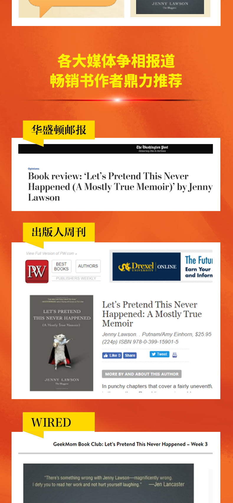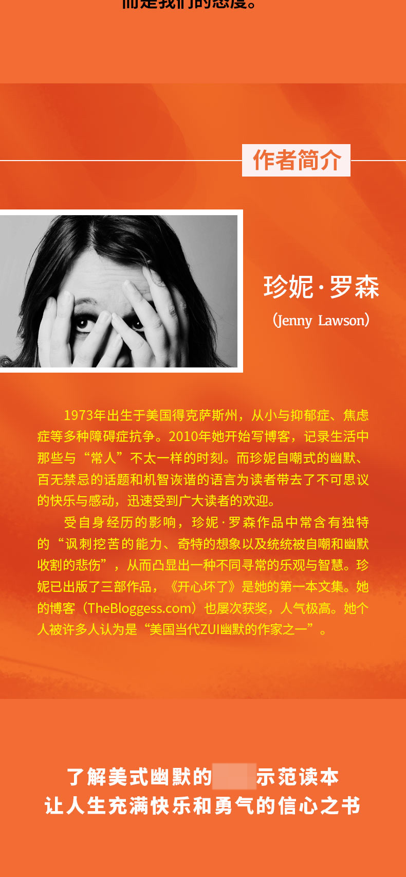 作者简介 珍妮·罗森 (Jenny Lawson) 1973年出生于美国得克萨斯州,从小与抑郁症、焦虑症等多种障碍症抗争。2010年她开始写博客,记录生活中那些与“常人”不太一样的时刻。而珍妮自嘲式的幽默、百无禁忌的话题和机智诙谐的语言为读者带去了不可思议的快乐与感动,迅速受到广大读者的欢迎。 受自身经历的影响,珍妮·罗森作品中常含有独特的“讽刺挖苦的能力、奇特的想象以及统统被自嘲和幽默收割的悲伤”,从而凸显出一种不同寻常的乐观与智慧,珍妮已出版了三部作品,《开心坏了》是她的第一本文集。她的博客(TheBloggess.com)也屡次获奖,人气极高。她个人被许多人认为是“美国当代ZUI幽默的作家之一”。