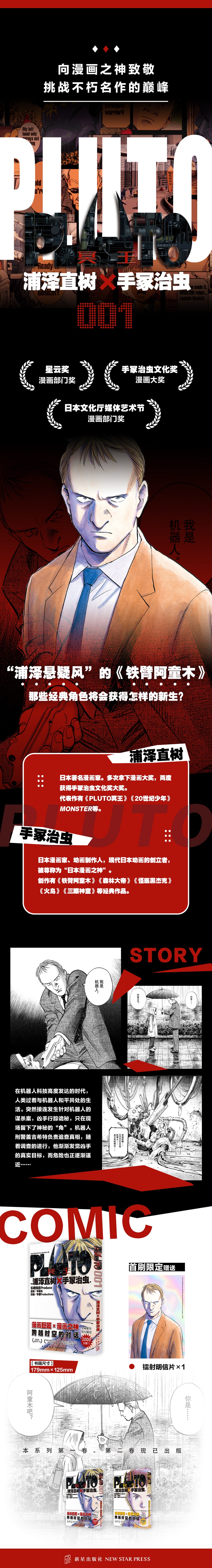 浦泽直树(1960-) 日本著名漫画家。于1983年出道,多次拿下漫画大奖,也是唯一两度获手冢治虫文化奖大奖的漫画家。代表作有《PLUTO冥王》《20世纪少年》MONSTER等。 浦泽直树的漫画涉及历史、犯罪、科幻等多种题材,其中不乏对人性与社会的深层探讨。独特的画风也是浦泽的标志之一。他描绘的人物偏向写实风格,微妙的表情与眼神更具有真人的神韵,简洁的分镜也使他的漫画具备了电影式的阅读体验。