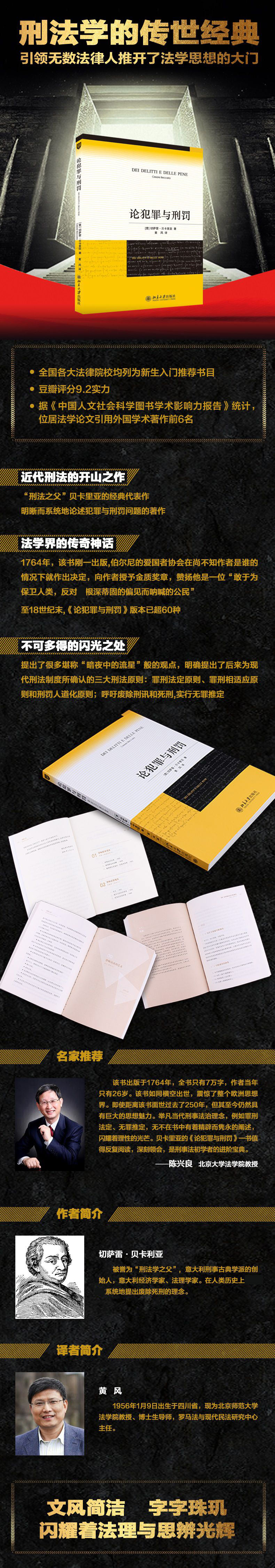 第2章 惩罚权 伟大的孟德斯鸠说:任何超越绝对必要性的刑罚都是暴虐的。人们可以把上述意思表述得更为普遍,即,人对人行使权力的任何行为,如果超越了绝对必要性,就是暴虐的。君主惩罚犯罪的权利就恰恰是建立在这样的基础之上的,即,以维护对公共利益的集存、防范个人的践踏为必要限度。(1)刑罚越公正,君主为臣民所保留的安全就越神圣不可侵犯,留给臣民的自由就越多。 我们对人的心灵作了调查,在那里,发现了君主惩罚犯罪的真正权利的基本起点。 道德的政治结果不以不可磨灭的人类感情为基础的话,就别想建立起任何持久的优势。任何背离这种感情的法律,总要遇到一股阻力,并最终被其战胜。正如一种虽然极小的力量,如果不断地起着作用,就能战胜任何传人肌体的强烈冲力一样。 没有一个人会为了公共利益而将自己的那份自由毫无代价地捐赠出来,这只是浪漫的空想。只要可能,我们当中的每一个人都希望约束别人的公约,不要约束我们自己,都希望成为世界上一切组合的中心。 人类的繁衍尽管本身规模不大,却远远超过了贫瘠荒凉的自然界为满足人们日益错综复杂的需要而提供的手段,这就使一部分野蛮人联合起来。为了抵抗这最初的联盟,必然又形成了新的联盟。就这样,战争状态从个人之间转移到国家之间。 由此可见,正是这种需要迫使人们割让自己的一部分自由,而且,无疑每个人都希望交给公共保存的那份自由尽量少些,只要足以让别人保护自己就行了。这一份份最少量自由的结晶形成惩罚权。一切额外的东西都是擅权,而不是公正,是杜撰而不是权利。请注意:“权利”一词与“力量”一词并不矛盾。但是,最好说前者是对后者的修正,即对大多数人有利的修正。至于“公正”,我指的只是把单个利益联系在一起的必要纽带,否则,单个利益就会涣散在古时的非社会状态之中。如果刑罚超过了维系上述纽带的需要,它本质上就是不公正的。 还必须注意:别把某种实物的概念,例如一种物理力和一种实在体的概念,与“公正”一词联系在一起。“公正”是人们的一种简单的思维方法,它对每个人的幸福产生着无限的影响。我这里讲的绝不是上帝所宣布的并与未来生活的赏罚有着直接联系的另一种公正。 …… 《论犯罪与刑罚》出版的是贝卡里亚的47章版,书中同时登载本书译者黄风先生所写贝卡里亚的个人传略和对其刑法思想的解读,其评述对国内读者也具有重要的意义与价值。