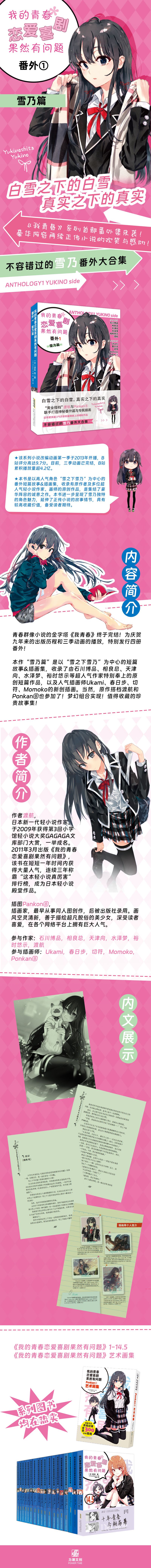 1.令人满足的一本书,有5位超豪华作家和渡航老师的参与。我很享受每一个故事中与正传不同的气氛。——日本读者 2.从中可以看到很多渡航老师以外的作家对《我青春》系列的印象,读起来非常有趣。另外,渡航老师竟然讲述了雪乃父亲的故事。这本故事集连后记都充满了个性,真是百看不厌。——日本读者 3.这是《我青春》的第一本选集,收录了6个以雪乃为中心的故事。我个人觉得,将棋故事中的八幡实在是太厉害了,渡航老师笔下的雪乃父亲的话让我忍不住流泪……给我印象最深的,是步入社会的雪乃的职场故事,雪乃的想法和行动让我感受到了自正传开始的成长和怀念,真是太好了。——日本读者