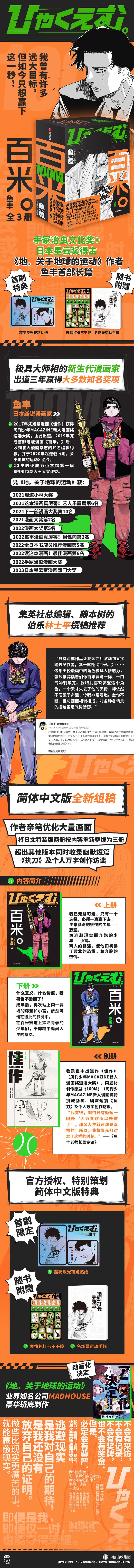 一、极具大师相的新生代漫画家 出道三年赢得大多数漫画荣誉 95后漫画家鱼丰出道代表作 先是凭借《百米。》的原型作品《100m.》获得第97届新人漫画奖特别鼓励奖,后又凭《百米。》套装中收录的短篇《佳作》获得第98届Magazine新人漫画特别奖获奖作品。 最新作《地。关于地球的运动》更是在连载三年间入选大量漫画奖项: 2021漫道小林大奖 2021这本漫画真厉害!艺人乐屋篇第6名 2021下一部漫画大奖第10名 2021漫画大奖第2名 2022漫画大奖第5名 2022这本漫画真厉害!男性篇第2名 2022全日本书店员推荐漫画第5名 2022读这本漫画!最佳漫画第6名 2022手冢治虫漫画大奖 2023日本星云赏漫画部门大奖 热血、有趣,且充满哲思与感动。这就是具有大师相的新生代漫画家。 二、集英社总编辑,藤本树的编辑伯乐林士平撰稿推荐 “只有两部作品让我读完后激动到直接跑去见作者,其一就是《百米。》……这部田径漫画中的角色极具人格魅力,强烈推荐读者们像百米赛跑一样,一口气冲刺读完。我特别喜欢藤坚这个角色。一个天才失去了他的天份,却依然不屈服于命运,令我非常着迷。金句不断,且与画面相辅相成,对各种名场景的描绘更是气势磅礴。” 三、台词极具冲击力。生活就是凭一个个热血沸腾的瞬间,跨过人生漫长无尽的不安。 “我最讨厌的,就是自我厌恶的自己!” “不要去想如何消除不安。生活就是充满了失败的可能,而人生的妙处也正在于此。要想的是,人不过是一群微不足道的细胞的集合体,如果我的人生注定失败,那就随他去。” “人注定会死,这是令人不安的残酷真理。然而,我们全力以赴时的幸福瞬间,可丝毫不会被这真理夺去。” 四、简体中文版重新组稿 特设《佳作:鱼丰特别短篇集》收录鱼丰出道作《佳作》(周刊少年Magazine新人漫画奖遴选大奖)、同题材创作原型《100m》(周刊少年Magazine新人漫画奖特别鼓励奖)、幽默短篇《执刀》,以及万字创作访谈。 五、简体中文版特别策划赠品 ①首刷限定:超亮反光夜跑贴纸 ②名场景运动手账 ③表情包打卡不干胶