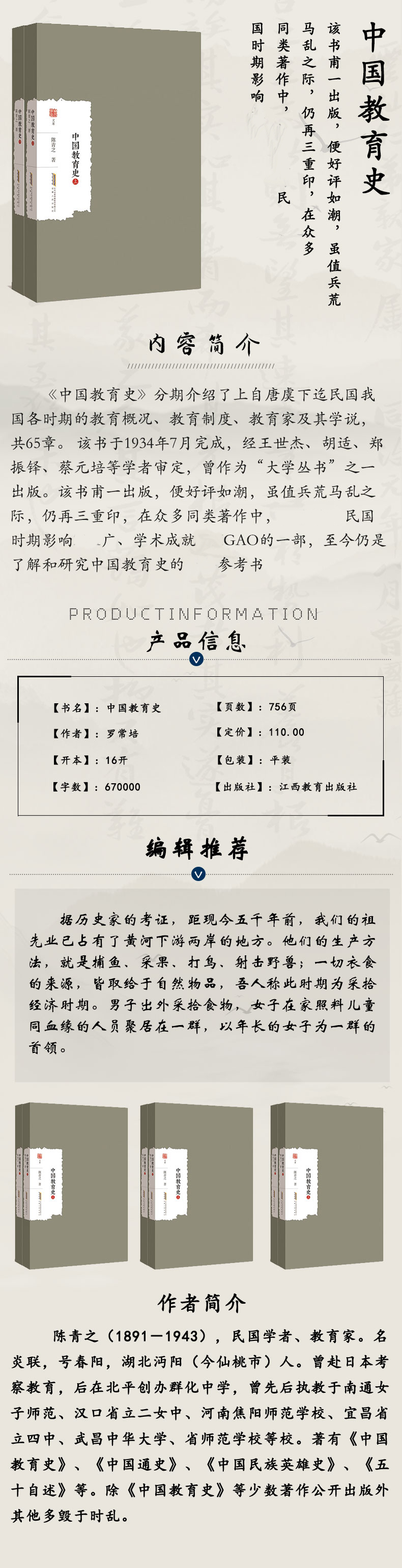 中国教育史(上下)/兰台学术文库 出版时间 2019-03-01T00:00 教育总论 71235 作者: 陈青之 出版社: 安徽人民 原售价: 110.00 折扣价: 66.00 折扣购买: 中国教育史(上下)/兰台学术文库 ISBN: 9787212102814 作者简介 内容简介 上一篇:课程与教学论(卓越教师教育系列教材)下一篇:世界因我更美丽学习手册/学生健康自我成长课程