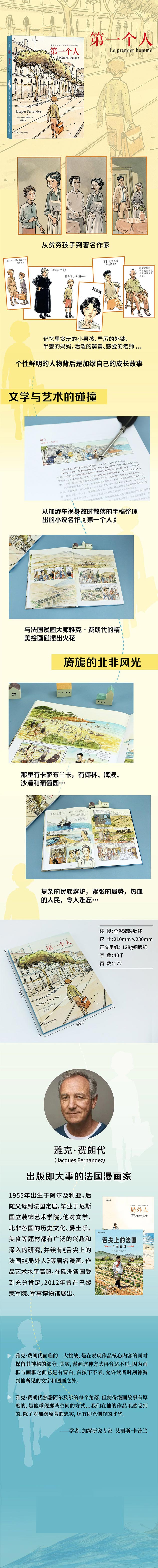 1,文学与艺术的碰撞:从加缪车祸身故时散落的手稿整理出的小说名作《第一个人》,与法国漫画大师雅克·费朗代的精美绘画,碰撞出火花。 2,加缪自己的成长故事:贪玩的小男孩,严厉的外婆,半聋的妈妈,活泼的舅舅,慈爱的老师……每个人物都个性鲜明,这是加缪自己从贫穷孩子到大作家的成长故事,每一段都可以细细品出生活的酸甜苦辣。 3,旖旎的北非风光:那里有卡萨布兰卡,有椰林、海滨、沙漠和葡萄园,有骄傲的阿拉伯人,也有长途跋涉来的欧洲移民。复杂的民族熔炉,紧张的局势,热血的人民,令人难忘。