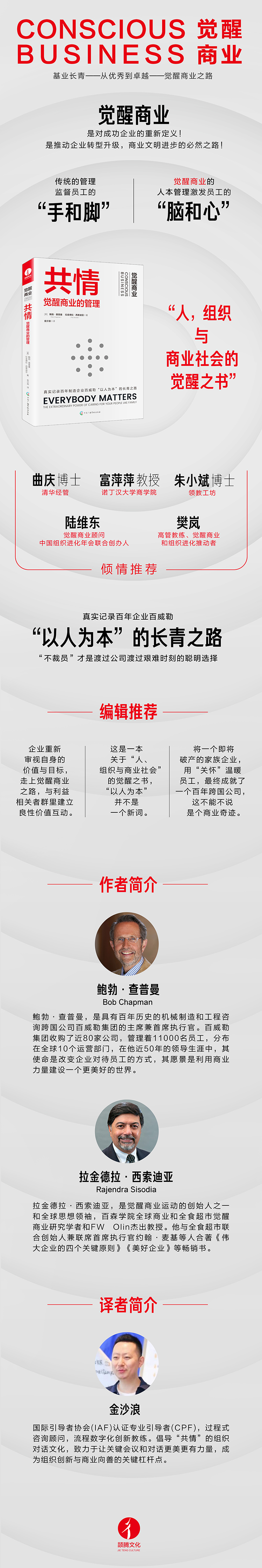 鲍勃·查普曼(鲍勃·查普曼),是具有百年历史的机械制造和工程咨询跨国公司百威勒集团(Barry-Wehmiller)的主席兼首席执行官。百威勒集团收购了近80家公司,管理着11000名员工,分布在全球10个运营部门,他的使命是改变企业对待员工的方式,他的愿景是利用商业力量建设一个更美好的世界。 拉金德拉·西索迪亚(Raj Sisodia),是觉醒商业运动的创始人之一和全球思想领袖,巴布森学院(Babson College)全球商业和全食超市觉醒商业研究学者和FW Olin商业研究生院杰出教授。他与全食超市联合创始人兼联席首席执行官约翰·麦基(John Mackey)著《伟大企业的四个关键原则》《美好企业》《共赢:觉醒商业的实践》等畅销书。 译者简介 金沙浪 国际引导者协会(IAF)认证专业引导者(CPF),过程式咨询顾问,流程数字化创新教练。深耕“创新、引导、视觉化”构建的整合性科学和艺术,钻研战略创新与落地、组织文化创新、产品和体验及流程创新、创造性解决系统问题、团队创新赋能5个关键会议领域。曾为各行业的全球500强组织设计实施引导型关键会议、创新引导者培养课程等多个项目。倡导“共情”的组织对话文化,致力于让关键会议和对话更美更有力量,成为组织创新与商业向善的关键杠杆点。 公众号:金沙浪嘿呦