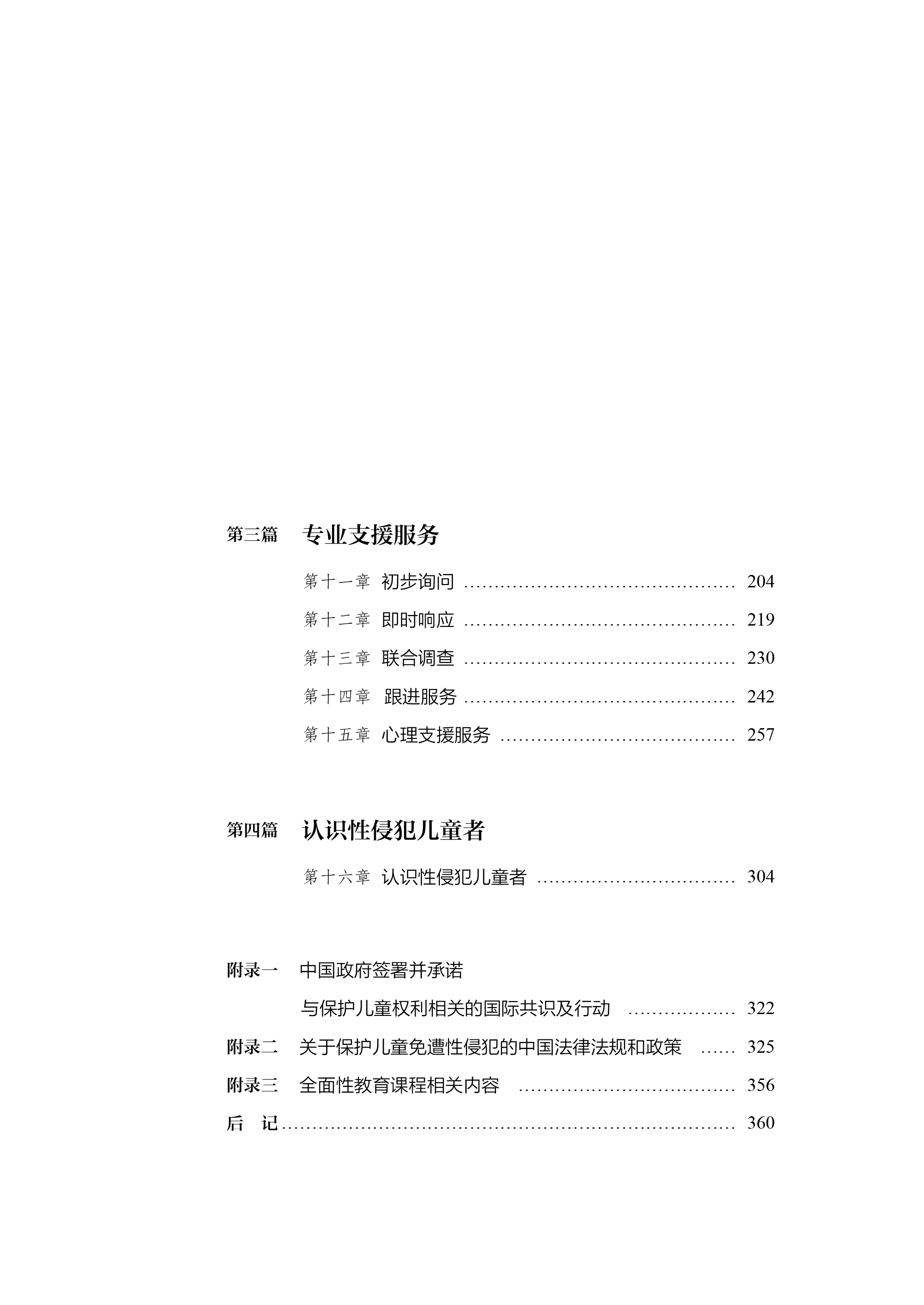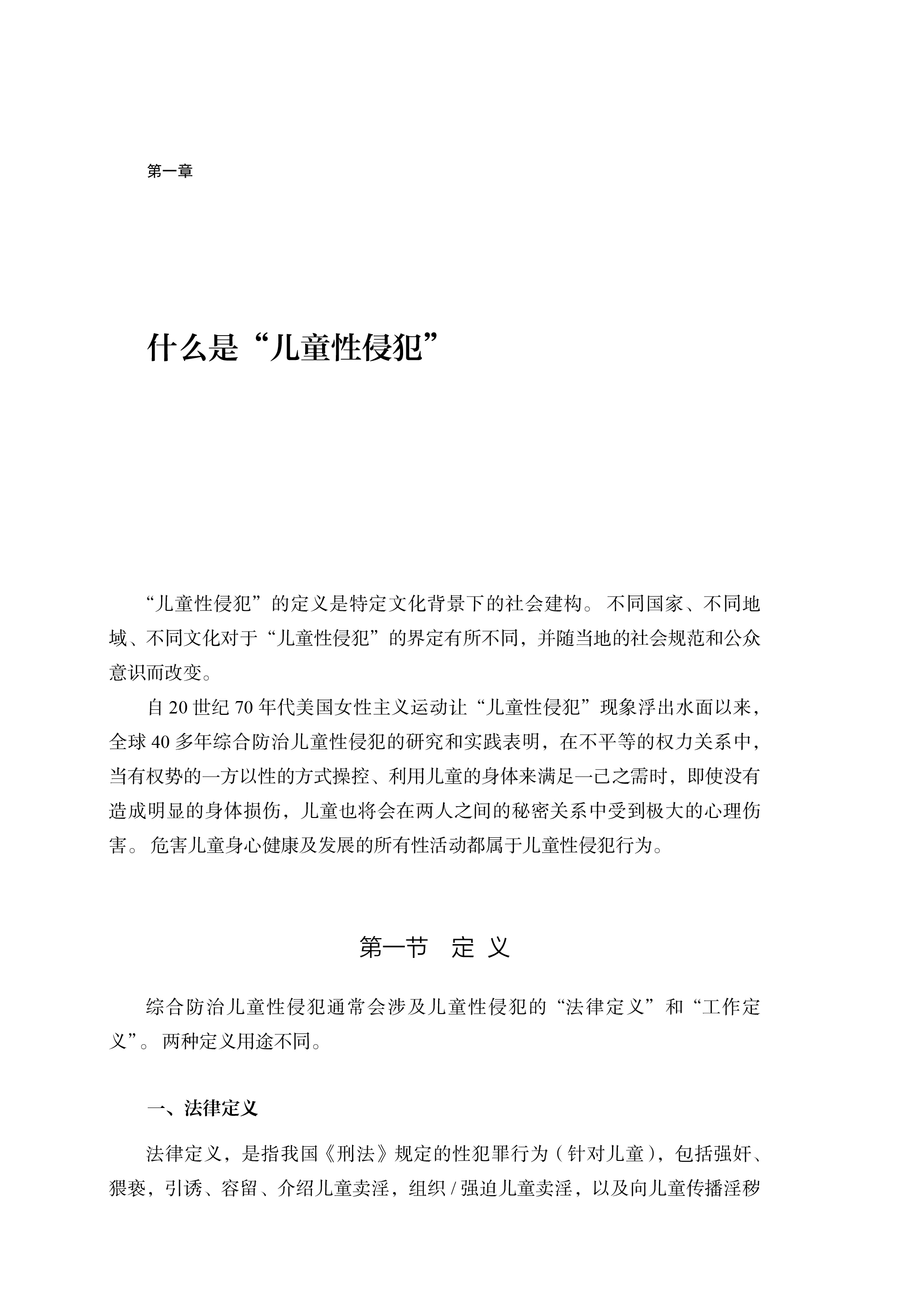 第一篇 认识儿童性侵犯 近年来,儿童性侵犯现象借助媒体报道在中国社会逐渐浮出水面。 然而,人们对于儿童性侵犯现象的认识却不一定准确。 例如,儿童性侵犯“一定会造成身体伤害”“没有身体证据,就不可能发生性侵犯”“如果儿童拒绝或反抗,性侵犯就不会发生”“性侵犯造成的伤害主要是处女膜的损坏”“男孩不可能受到性侵犯”“侵犯者主要是陌生人”……这些误解很容易演化成责备受害者的公众态度和专业话语,不利于有效地防治儿童性侵犯。在本篇,我们将以权威文献为依据,从定义、迷思与事实、负面影响、风险机制、披露与识别五个方面,协助读者深入、系统地认识儿童性侵犯现象,作为“预防儿童性侵犯”和“专业支援服务”的知识基础。 第一章 什么是“儿童性侵犯” “儿童性侵犯”的定义是特定文化背景下的社会建构。不同国家、不同地域、不同文化对于“儿童性侵犯”的界定有所不同,并随当地的社会规范和公众意识而改变。 自20世纪70年代美国女性主义运动让“儿童性侵犯”现象浮出水面以来, 全球40多年综合防治儿童性侵犯的研究和实践表明,在不平等的权力关系中,当有权势的一方以性的方式操控、利用儿童的身体来满足一己之需时,即使没有造成明显的身体损伤,儿童也将会在两人之间的秘密关系中受到极大的心理伤害。危害儿童身心健康及发展的所有性活动都属于儿童性侵犯行为。 第一节 定 义 综合防治儿童性侵犯通常会涉及儿童性侵犯的“法律定义”和“工作定义”。两种定义用途不同。 一、法律定义 法律定义,是指我国《刑法》规定的性犯罪行为(针对儿童),包括强奸、猥亵,引诱、容留、介绍儿童卖淫,组织 / 强迫儿童卖淫,以及向儿童传播淫秽物品等危害儿童身心健康 / 发展的行为。详见本书附录二。 司法部门以法律定义作为定罪标准,衡量犯罪嫌疑人是否犯罪及犯罪程度。因此,从法律层面界定儿童性侵犯行为,要非常清楚地界定犯罪行为,以便量刑定罪,并平衡考虑保护犯罪嫌疑人应有的基本人权。 二、工作定义 工作定义,是从保护儿童免受性侵犯伤害的角度来界定性侵犯儿童的行为,其范围不仅包括《刑法》规定的性犯罪行为,还包括《刑法》中没有规定但是侵 犯儿童权利、危害儿童身心健康及发展、与性有关的行为。 工作定义主要用于专业人员辨识儿童性侵犯现象,从而确定预防和专业支援服务的工作范围和有关儿童性侵犯的研究范畴。 儿童保护部门和社会服务部门需要根据儿童性侵犯的工作定义进行服务需求评估,包括:需要阻止哪些性行为的发生,才能避免危害儿童身心健康与发展?受害儿童及其家庭是否需要专业支援服务?需要怎样的服务?何时需要?…… 专业人员将根据评估结果提供相应的专业服务。 本书关注的重点是儿童性侵犯的工作定义。有关儿童性侵犯的中国法律定义以及相关的政策法规参阅本书附录二。 三、权威工作定义的解读 下面,我们选取三个有代表性的权威工作定义,解读其中的核心含义,从而提出本书使用的工作定义。 世界卫生组织(WHO)对于“儿童性侵犯”的工作定义是: 使尚未发育成熟的儿童参与其不能完全理解,或无法表达知情同意,或违反法律,或触犯社会禁忌的性活动。对儿童进行性侵犯的人可能是成人,也可能是年龄较大或相对比较成熟的其他儿童;他们相对于受害者在责任、义务或能力方面处于优势地位(Kung EG et al., 2002; WHO, 2014)。 该定义试图概括世界各地的儿童性侵犯现象,因而没有规定性侵犯的具体行为,但着重强调,儿童性侵犯的核心是滥用权力差异侵犯儿童权利。 香港社会福利署提出的“儿童性侵犯”工作定义类似 WHO 所提出的定义。所不同的是,前者对侵犯者的身份和性侵犯的行为方式有比较具体的说明,即: 牵涉儿童的非法性活动(例如强奸、口交),或儿童不能做出知情同意的性活动,包括直接或间接对儿童做出性方面的利用或侵犯(例如 制作色情物品)。性侵犯可能发生在家中或其他地方,侵犯者可能是儿童的父母、照顾者、其他成人甚至其他儿童,侵犯行为可以个别或有组织的方式进行。性侵犯包括以奖赏或其他方式引诱儿童加以侵犯,侵犯者可能是儿童认识的人或是陌生人(香港社会福利署,2015)。国务院妇女儿童工作委员会办公室 2014 年颁布的《儿童暴力伤害预防与处置工作指引》把“儿童性侵犯”定义为: 既包括违反儿童的意志强行对其实施性行为,也包括在儿童不知情或者没有达到性自主的年龄、不具备理解能力的情况下对其实施与性有关的行为……可以是《刑法》规定的性犯罪行为,也可以是《刑法》没有规定但是侵害儿童性权利、危害其身心健康的行为,如已满十四周岁不满十八周岁男童被猥亵、女童自愿与他人发生性关系而受到伤害的情形等。 该定义还具体说明了针对儿童的性犯罪行为“主要包括强奸、猥亵,引诱、容留、介绍儿童卖淫,组织、强迫儿童卖淫以及向儿童传播淫秽物品等危害儿童 身心健康的行为(国务院妇女儿童工作委员会办公室,2014)”。 该定义与 WHO 定义一致的部分是,把“儿童无法表达知情同意”放在首位,特别强调儿童性侵犯“也可以包括《刑法》没有规定但是侵害儿童性权利、危害其身心健康的行为”,体现了我们国家的社会进步——以儿童权利为基础来定义“儿童性侵犯”。依据这