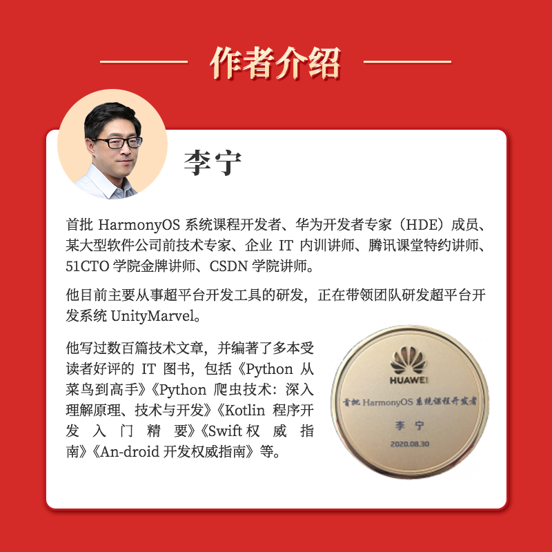 李宁,计算机专业硕士,首批HarmonyOS系统课程开发者,某大型软件公司前高级技术专家,IT畅销书作者,企业IT内训讲师,腾讯课堂特约讲师,CSDN学院高级讲师。曾出版多本IT畅销书,写过数百篇技术文章。主要著作包括《Kotlin程序开发入门精要》《Swift 权威指南》《Android开发权威指南》《Android深度探索》等。