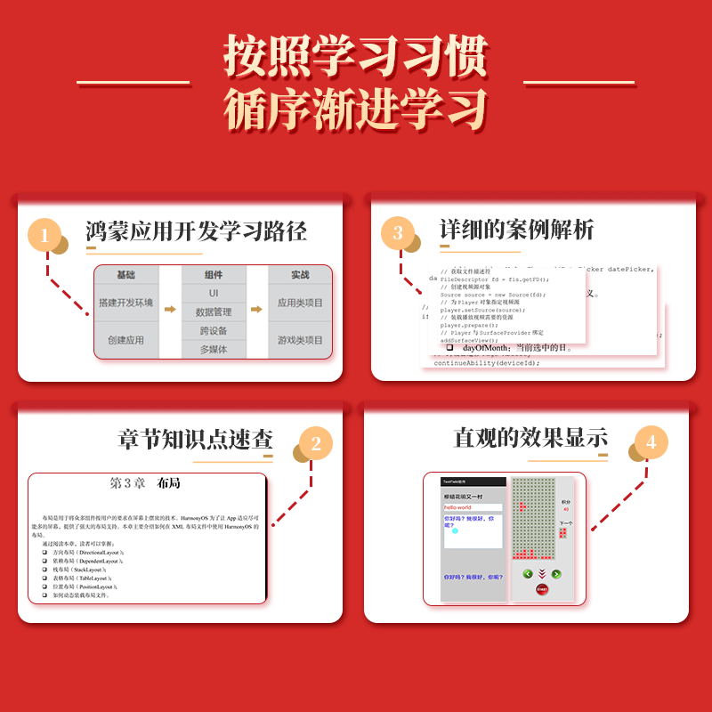 1.基于Java的全场景开发指南,可在各个鸿蒙系统设备上进行应用开发 2.系统讲解鸿蒙核心技术和分布式特性 3.基于鸿蒙真机作为载体的丰富案例及两个完整App实战项目 4.提供所有案例和实战项目源代码及配套视频