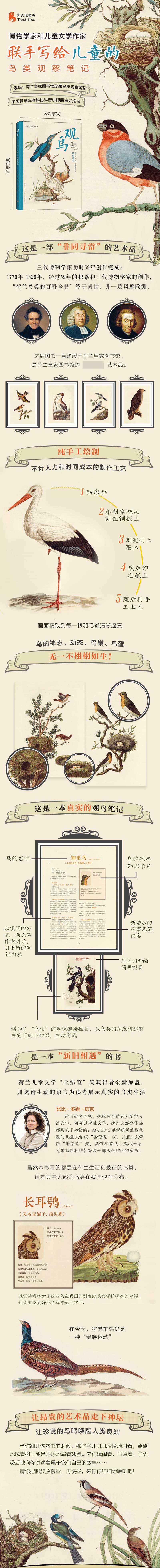 灰伯劳(又名寒露)Lanius excubitor在诺泽曼和赛普的厚书里,差一点没有给这种鸟安排位置。为什么呢?因为诺泽曼以为灰伯劳只在冬天来荷兰。“谁不在我们的夏天的太阳下建造鸟巢,谁就不是属于我们的鸟类。”规矩就是规矩。灰伯劳出局了。可是……后来有个来自兹沃勒附近的人拜访了诺泽曼先生。他带来了一个灰伯劳的鸟巢。对牧师来说,这是惊天动地的事呀。那个人提供了雄鸟和雌鸟,以及它们的蛋。这不可能有错,灰伯劳可以被纳入“荷兰鸟类圣经”。灰伯劳的这个学名的意思是“站岗的屠夫”。哇啊啊!这听起来很吓人。给这只鸟取了这个名称的人——又是那个瑞典人林奈——是不是看了太多的恐怖小说?没有的事,他只是很仔细地研究了这种小鸟的行为。灰伯劳是鸣禽,但从行为看,它更像猛禽。它不吃种子、梅子或饲料板上的面包块,它吃的是肉。当它锁定了一个猎物,就会俯冲到猎物身上,然后用强有力的喙把猎物彻底啄死,但不是立即吃掉它。它把猎物带到灌木丛,把它存放在那儿。为了防止那些老鼠、蜥蜴、甲壳虫或鹪鹩从树枝中间掉落在地上,它把受害者插在一根刺儿或尖利的树枝上。灰伯劳做的事情跟屠夫做的一样:将肉牢牢地插在钩子上,让肉安全地吊在那儿,直到需要的时候再吃。然后呢?它为什么叫作“站岗的屠夫”,而不是“唱着歌的屠夫”,或者“戴着面具的屠夫”,或者“黑白灰色的屠夫”?林奈把灰伯劳叫作“站岗的”,是因为它常常停在树顶或电线杆子上守望,密切注视周围情况。如果有一只猛禽飞来,它会向整个“居民区”发出警报,让所有动物都知道:强盗来了!灰伯劳既站岗又屠杀,因此,这是鸟类之国的恐怖剧。但它再也不在荷兰孵蛋。用诺泽曼的话来说:灰伯劳再也不是荷兰的鸟。然而,它还是被收入这本书中,说不定不久后还会有人带着一个鸟巢拜访我们。哦……一个小鸟巢的照片。有着站岗的灰色小屠夫的小鸟巢。 荷兰皇家图书馆珍藏“国宝级”鸟类画作,三代博物学家历时59年创作完成。荷兰儿童文学“金铅笔”奖获得者比比·多姆·塔克,用诙谐生动的语言为读者展示真实的鸟类生活。跨越250年的历史,记录鸟类在生存与灭绝中的变迁,反映人类与自然从索取与被索取到和谐共处的演变。中国科学院老科协科普讲师团审定推荐。