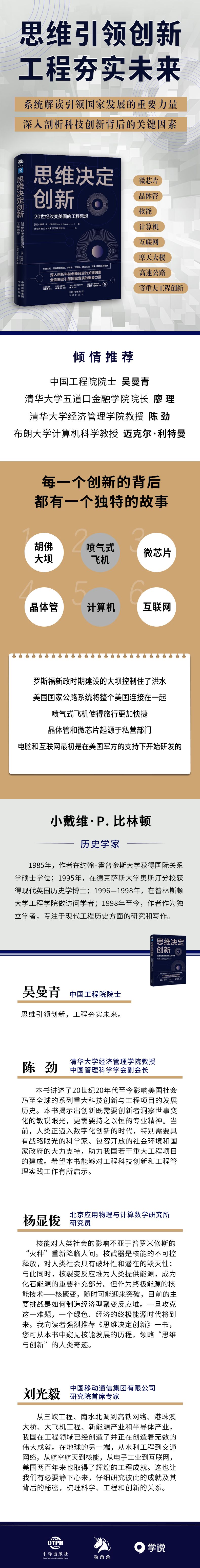中文版推荐序 从洞见到创新 本书讲述的是1920年以来改变美国乃至世界的一系列重要的技术创新,以及这些创新从产生到实现的全过程。这些创新既包括了美国的大型公共工程,例如胡佛大坝、高速公路以及登月工程,也包括了晶体管、集成电路、计算机和互联网。 通过详细描述这些创新的故事,作者希望告诉我们,有的创新伴随着科学的重大发现和发明,有的创新是利用现有技术的组合,而有的创新是在现有的技术上改进完善以解决重大的现实问题。其次,所有这些创新都是通过工程来实现的,因此对于越来越多的渐进型创新来说,工程师的创造性思维和工程上的实现特别重要。最后,对于很多公共工程领域的技术创新,政府的支持也是不可或缺的。 本书既可以作为一本技术素养的普及读物,也可以作为一本技术创新的励志教材,书中的故事引人入胜。例如,20世纪20年代初期,美国垦务局(Bureau of Reclamation)总工程师弗兰克·韦茅斯(Frank Weymouth)接到了胡佛大坝(Hoover Dam)的设计任务,他打破了工程师传统的重力坝设计思路,改用拱形水坝设计。所谓重力坝,就是依靠大量混凝土质量或重量来阻挡水流趋势;而拱形设计可以将水平力向四周传导,以分散水势的压力。与重力坝相比,拱形水坝所需的材料更少,却能与重力坝一样,达到的相同效果。在大坝建设的相近时间,美国国内汽车的登记数量达到800万台,汽车的普及对美国道路提出了更高的要求,由托马斯·麦克唐纳(Thomas MacDonald)领导的公共道路局筹划并建设了美国20世纪最伟大的基建项目——全国公路路网。麦克唐纳对车辆和路面之间的相互作用进行了科学研究,发现路面不平整对道路的损害要大于汽车重量造成的损害,因此开始采用波特兰水泥或沥青制成的混凝土铺设道路代替原先的碎石铺设路面;更为重要的发现是,充气轮胎给路面带来的危害远小于当时的实心轮胎,于是汽车都开始采用充气轮胎。1945年后,美国大城市核心商业区地产价格不断攀升,对高层建筑的需求只增不减,但是高层建筑的造价却极其高昂。工程师法兹勒·汗(Fazlur Khan)开始思考摩天大楼的造价问题,并用框架筒体系解决了这一难题。所谓的框架筒体系,是指一幢大楼能通过外部的框架受力,形成盒状,即将建筑包裹成正方体或者长方体一样的筒。比起过去利用立柱和横梁平均分担的方式,这种方式能够更好地抵御风力,并且使用较少的钢材。20世纪50年代,核裂变作为核能的替代能源一直是研究焦点。1948年7月,美国海军船舶管理局决定任命海曼·里科弗(Hyman Rickover)负责研制一种可控的核裂变作为动力的潜艇研发项目。当时潜艇普遍采用内燃机和电池保持航行,这样的动力组合难以保持长时间续航。如果能够利用少量铀产生的核能将水加热成蒸汽,就可以驱动发动机,使潜艇保持数周或数月在水下工作。但是,当时没有将核裂变能量转变为电能的实用系统,并且潜艇内部空间有限,潜艇的核动力系统必须能够承受运动和作战带来的冲击;此外,核动力系统还存在辐射的危险。里科弗和工程师们通过设计一种名为Mark Ⅰ的动力系统顺利完成了一次发热的可控核裂变反应。20世纪30年代,工程师们发现螺旋桨技术存在局限性,即随着螺旋桨叶的旋转速度接近声速,机头的空气阻力急剧上升,飞行高度受到限制。弗兰克·惠特尔(Frank Whittle)认为,通过使用液体在燃烧室形成压缩空气然后喷射出来形成推动力,可以设计出飞行更高、更快的喷气式发动机。惠特尔设计的涡轮喷气发动机包括轴、压缩机叶轮和涡轮,将空气送入发动机,机身尾部的一个喷嘴排出尾气。试验表明,与英国最好的螺旋桨战机相比,该机的速度和机动性具有极大优势。20世纪50年代,晶体管发展遇到新的问题,买家(尤其是军方买家)需要在电子设备中添加更多电路,以满足不断增加的性能需要,这就需要压缩电路体积。1958年夏天,德州仪器公司的杰克·圣克莱尔·基尔比(Jack St. Clair Kilby)认为晶体管和其他电路都可以由硅之类的单一材料制成,而不是当时业界公认的必须加入其他元素。1959年初,加利福尼亚州仙童半导体公司的罗伯特·诺伊斯(Robert Noyce)发现,可以利用机器组装整个电路,无须人工连接。基尔比和诺伊斯的发现促进了集成电路(又称为微芯片)的 诞生。 这本书是美国关于技术创新三部曲的第三部。在介绍这些重大技术创新的来龙去脉的同时,作者用简单、易懂的数学概念和图形为读者清晰阐释了技术创新路线,让读者深入浅出地了解技术创新原理以及工程实现的全过程,可读性很强。 当前,我们正处在百年变局和民族复兴的重要历史时期,建设创新型国家和制造业强国都迫切需要提高全民族的创新意识和工程素养,因此了解历史上重大的技术创新的产生背景和实现过程非常必要,尤其需要了解工程思想和工程师在其中所起的重要作用。 希望大家喜欢这本书。 廖?理 清华大学五道口金融学院教授、博士生导师 2022年4月 于北京 英文版推荐序 创新改变了我们的社会 “我拥有了自己的想法和想象力”——杰克·圣克莱尔·基尔比是这样描述他开发出微芯片的过程的。微芯片仍在继续塑造着我们的现代世界。微芯片技术使得人们在一小片硅上能够制造出带有数十亿个晶体管的小型计算机芯片。微芯片是引领当下信息时代的一大创造,这是一项影响现代生活各个方面的根本性创新