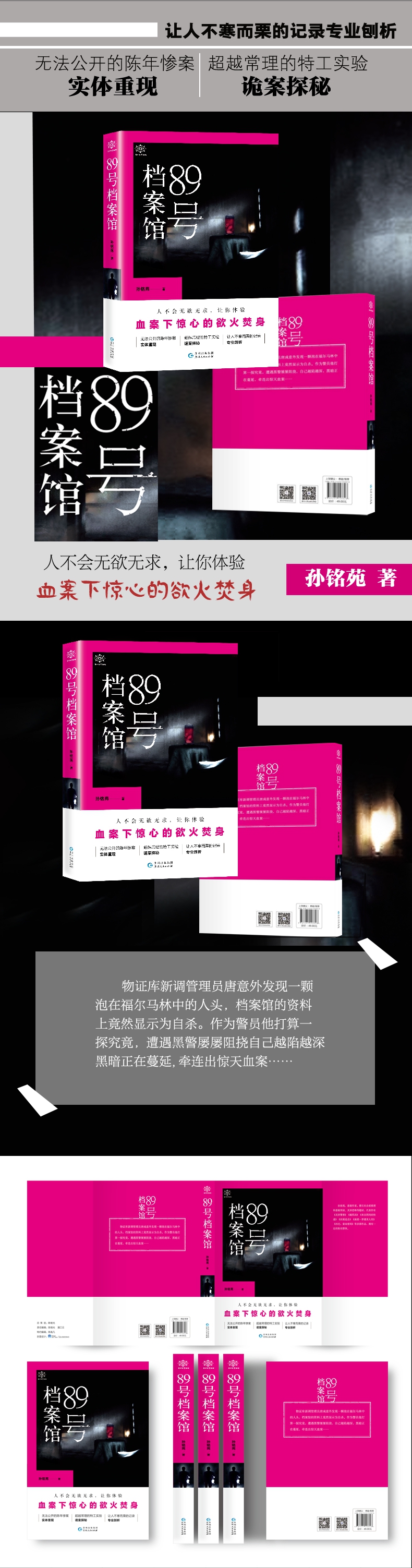 第一章 人头睁眼 人要倒霉,喝口凉水都塞牙。 倒霉事之一,可能是因为最近心情压抑的缘故,少年时期经常做的噩梦再度闯入我的睡梦里。 噩梦中,我好像被一大团火焰追着跑,一路跑出火海,脚下跟踩着风火轮一样,仿佛脚底板都在着火。 我好不容易跑出火场,却一头撞进了一座古怪的小亭子。 烟雾弥漫中,小亭发的横梁上挂着一串串人骨头,风一吹,发出让人毛骨悚然的撞击声。四下里空无一人,我却觉得无数双眼睛仿佛在背后盯着我,让我如芒在背。 心理医生经常会告诉你,你的恐惧和癖好、噩梦什么的都和童年经历有关。然而,我却不记得我经历过任何火灾。 倒霉事之二,今年,我好不容易进了梦寐以求的刑警队,却因为调查一件案子的时候出了些问题,居然就被调职到了物证保管仓库。 物证保管仓库,就是堆积了一些悬案、凶杀案、陈年旧案的物证仓库。这仓库就在我们警局的最北面,在地下一层,由于是地下室,这地方和商场超市一样,常年不见阳光,也没窗户,只有通风口。 这里虽然也有空调、灯光、电脑网线等,设备齐全,环境宽敞,然而就是没有人气儿。 据说,这仓库还是个特别邪门的地方。就算不开空调,夏天也是冷飕飕的。墙角常年长霉斑,怎么清扫都没用。 当然,我不信这个邪,只是觉得大好年华却要耗费在这“冷宫”里,着实心中不忿。 我平时的工作无非就是给物证登记、清点。我闲暇下来就打扫一下屋子, 超级无聊。我觉得更无聊的是,这偌大的仓库算上我,就俩人。 另一个“仓管”,我简直无力吐槽——是个姓何的大叔,四十五六的年纪, 个子不算太高,脸上天天堆满笑,对谁都很和气,得过且过一老油条。 但让我奇怪的是,来往的同事们对他特别恭敬。而每个月十五日,局长都会亲自溜达过来看看他,聊上几句,开点儿玩笑,准时准点,跟拜佛似的,这倒是让我很意外。琢磨半天,我觉得这老头儿肯定是哪个领导的亲戚,是安插过来养老的。 想到这里,我对这何老头儿更不待见了。我特别烦这类靠背景的货色,于是在背后给老何取了一绰号:何事佬。 何事佬还有一个奇怪的癖好:喜欢在屋里点熏香,说是物证仓库这边太潮湿,霉味儿重,就拿香熏熏。 他这香料的香味倒是还不错,只是味道有些特别,让人说不出是什么花香。不过我对这个没什么概念,他喜欢点香就点,反正不难闻就是了。 虽然我不喜欢搭理何事佬,他却有事没事地跟我瞎聊。 比如我刚来的第一天,就跟我套近乎:“小伙子叫唐彧?哟,名字不错啊, 哪年生的?” 我一边扫地一边回话:“1989 年的。” “月份跟日子呢?”老头儿追问道。 我有点儿不耐烦:“三月二十四。” “阴历阳历?”老头儿继续笑问道。 我一扔扫帚,没好气地说道:“我说大叔,您这查户口呢?咱这儿也不是户籍科啊?” 老头儿端起紫砂壶喝了一口茶水,啧啧地说道:“年轻人啊,你不知道, 我守了这古董仓五年,来这儿的同事前后有十个,都是好好地来,缺胳膊少腿或者鼻青脸肿地 走。这地方邪门得很啊。小伙子命不够硬的话就考虑申请调走吧。” 无法公开的陈年惨案,实体重现 超越常理的特工实验,诡案探秘 让人不寒而栗的记录,专业剖析 人不会无欲无求,让你体验血案下惊心的欲火焚身! —— ——作品创新的角度,多元化的故事情节,融合各方面知识;快节奏剧情,没有腻歪的谈情说爱成分,男男CP联手破案吸引人;将看似难以解释的灵异故事和悬案结合在一起,并用科学方法揭秘,设计新颖。 作者多年写悬疑的经验,角度新奇,选材新颖,不遵循老套路,是比较创新的悬疑作者。知识面广博,贯通古今的奇思妙想,能将传统元素融入现代故事里。
